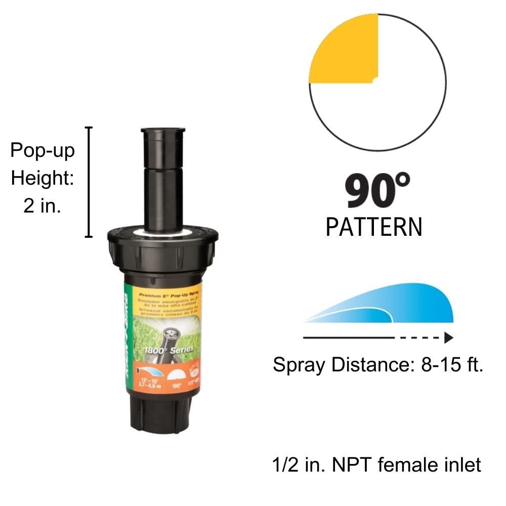 2 inch Pop-up Sprinkler. 1800 Professional Series. Up to 15 feet spray distance. 90 Degree fixed pattern. Heavy-duty design for longest life. #1 Best Selling sprinkler in the world. 1/2-in female threaded inlet. Heavy-duty stainless-steel spring helps ensure flush retraction every time. Patented pressure-activated wiper seal prevents wasteful water leakage and helps assure long life. Color: Black