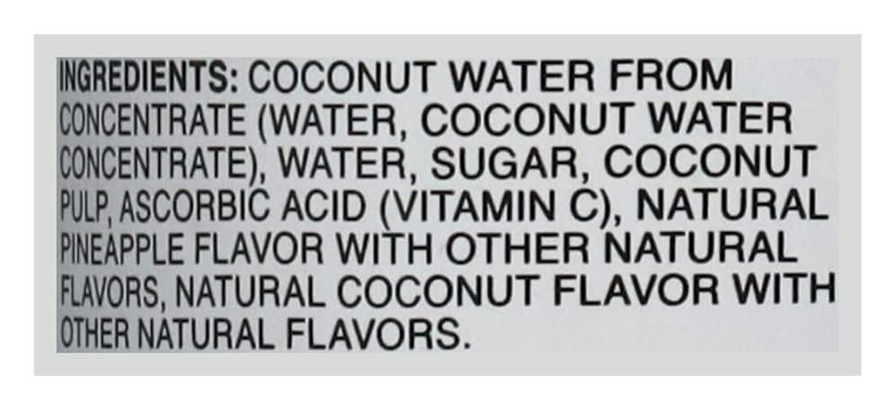 Ingredients: Coconut Water from Concentrate (Water, Coconut Water Concentrate), Water, Sugar, Coconut Pulp, Ascorbic Acid (Vitamin C), Natural Pineapple Flavor with Other Natural Flavors, Natural Coconut Flavor with Other Natural Flavors