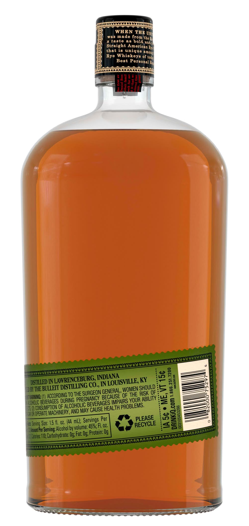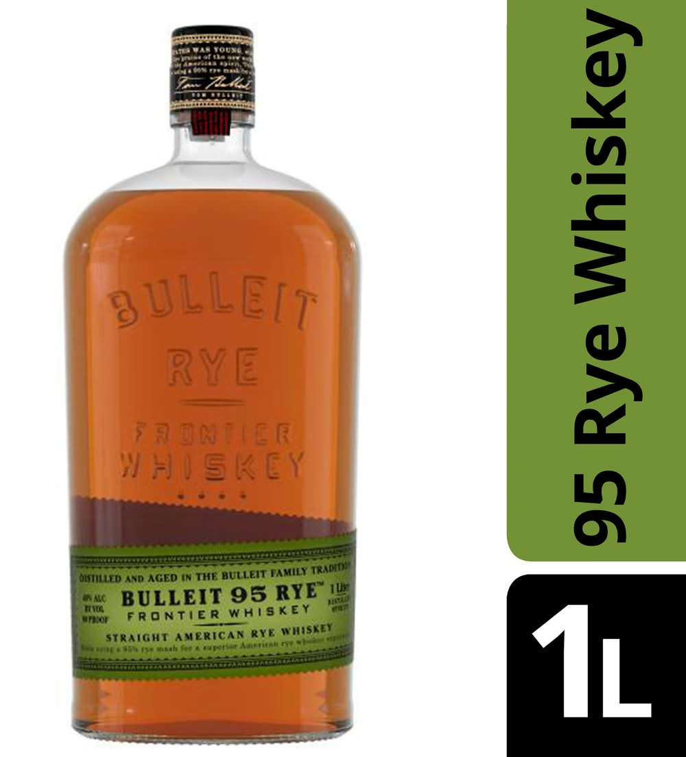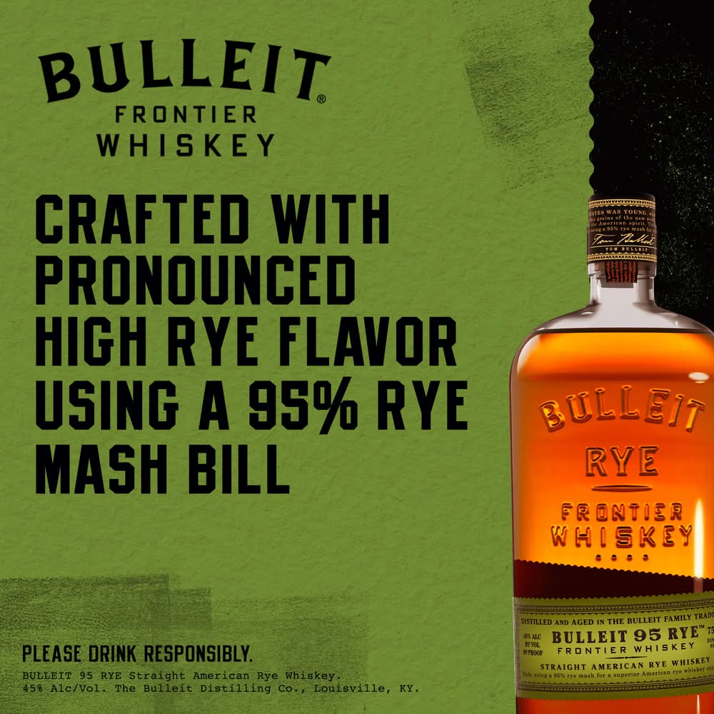Savor the bold, spicy character of Bulleit 95 Rye Whiskey. With its russet color and aromas of biscuit, spice and dried apricot, our straight rye whiskey makes a good first impression before it's even opened. Its distinctive taste leads into a generous finish that is long, satiny and woody with a hint of light toffee. The flavor profile of our rye whiskey allows you to enjoy its clean finish that lingers long after the final sip. Bulleit 95 Rye Whiskey earned a Gold medal at the 2021 San Francisco World Spirits Competition. Perfect for a classic Manhattan cocktail. Includes one 90 proof 1.75 L bottle of 95 Rye Whiskey. Please drink responsibly. • Alcohol by volume: 45% • Bulleit Distilling Company, 1151 Canal Street, Louisville, KY 40204 • Packaging: Reusable