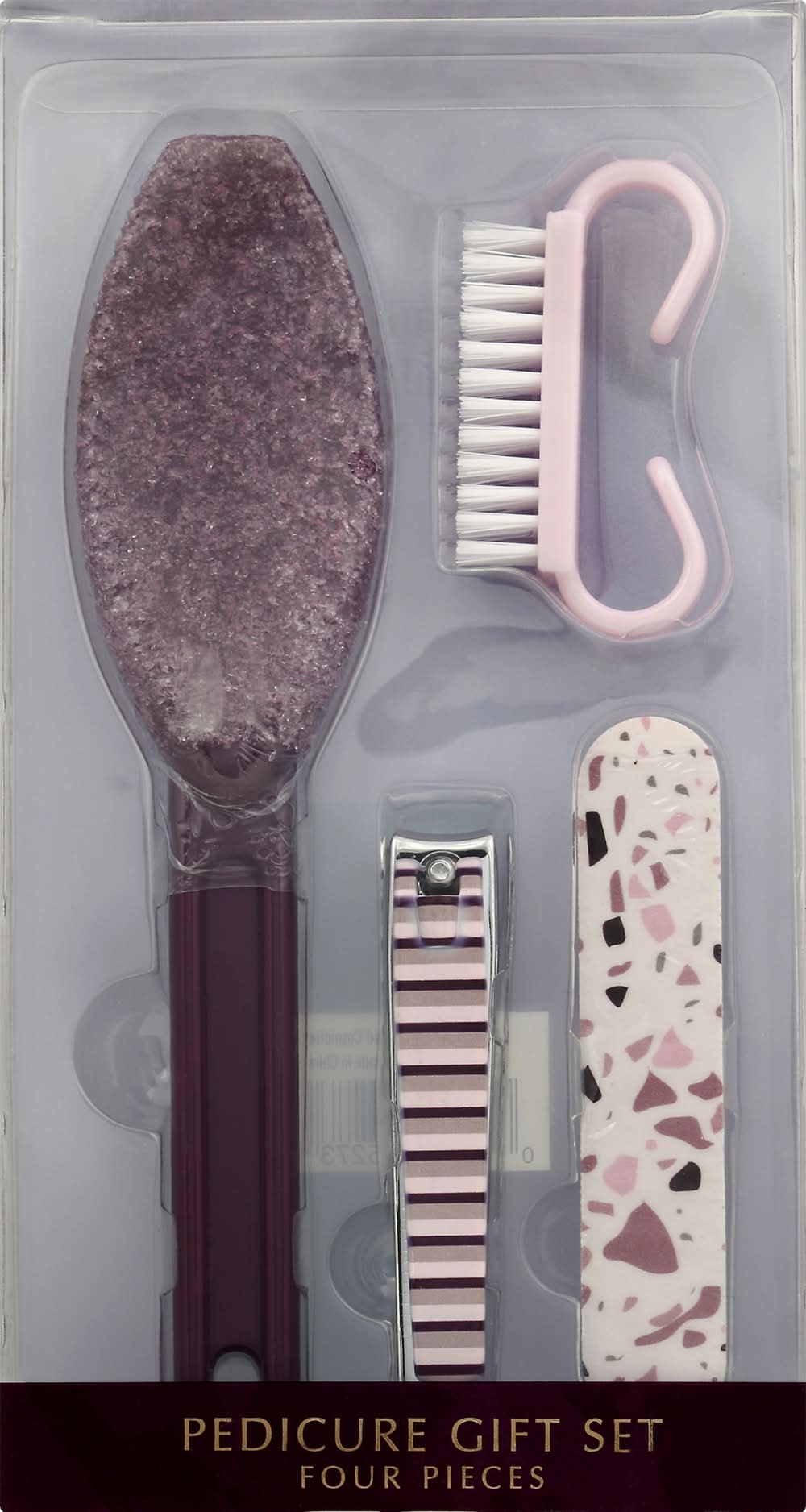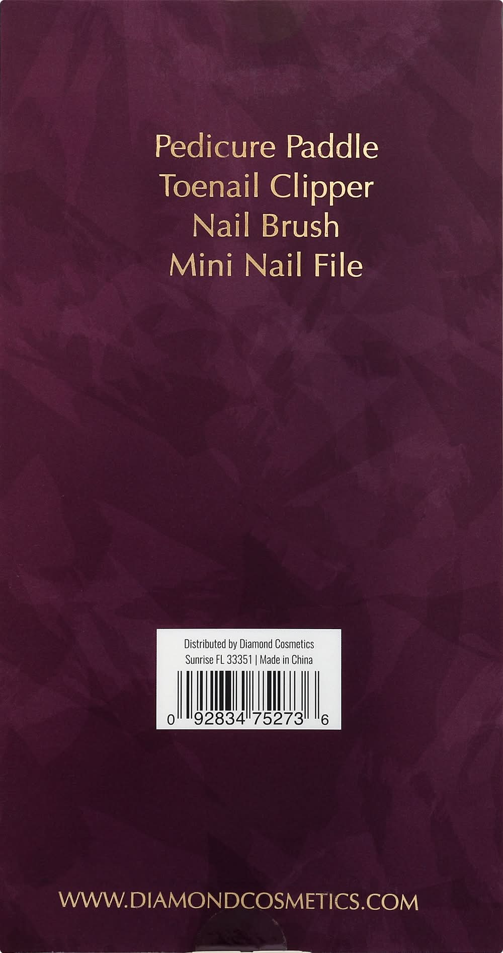 Four pieces. Pedicure Paddle. Toenail Clipper. Nail Brush. Mini Nail File. www.diamondcosmetics.com. Made in China. Diamond cosmetics,