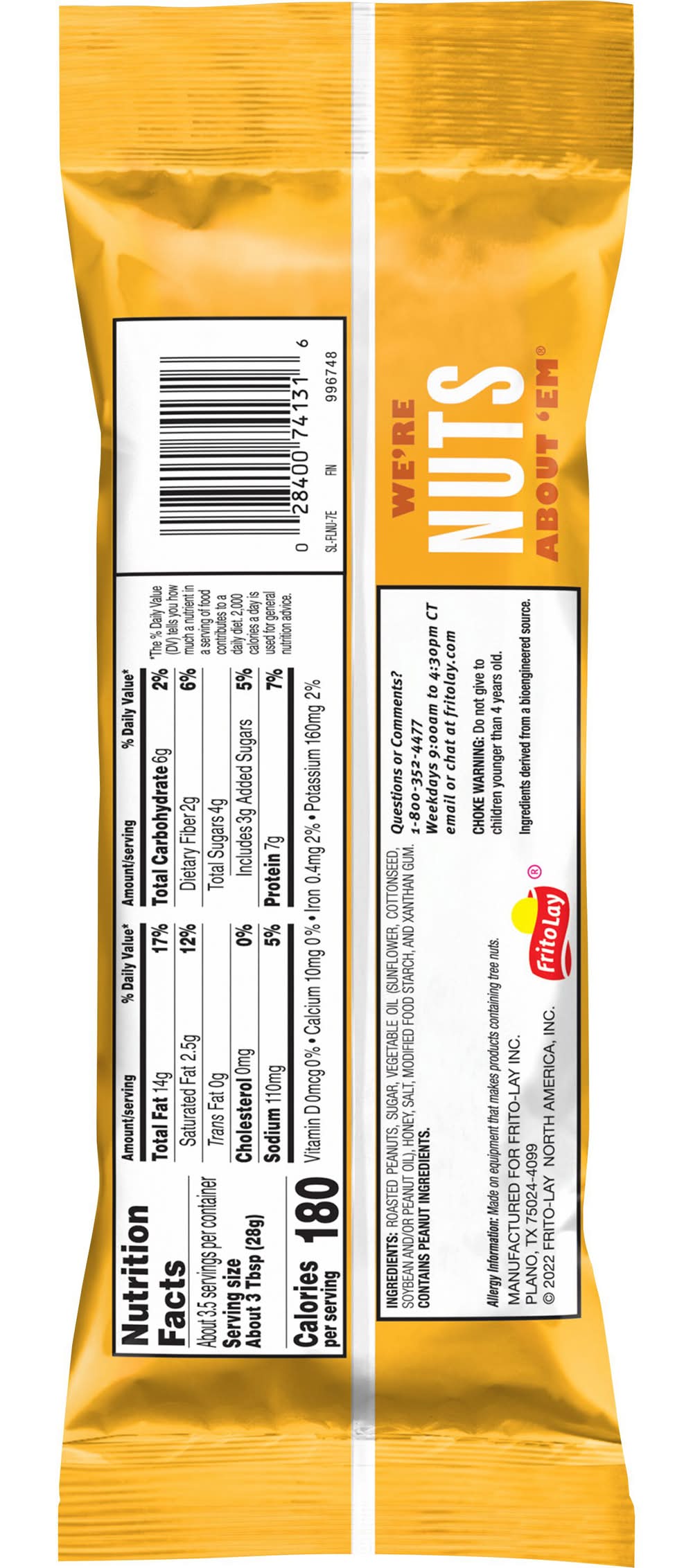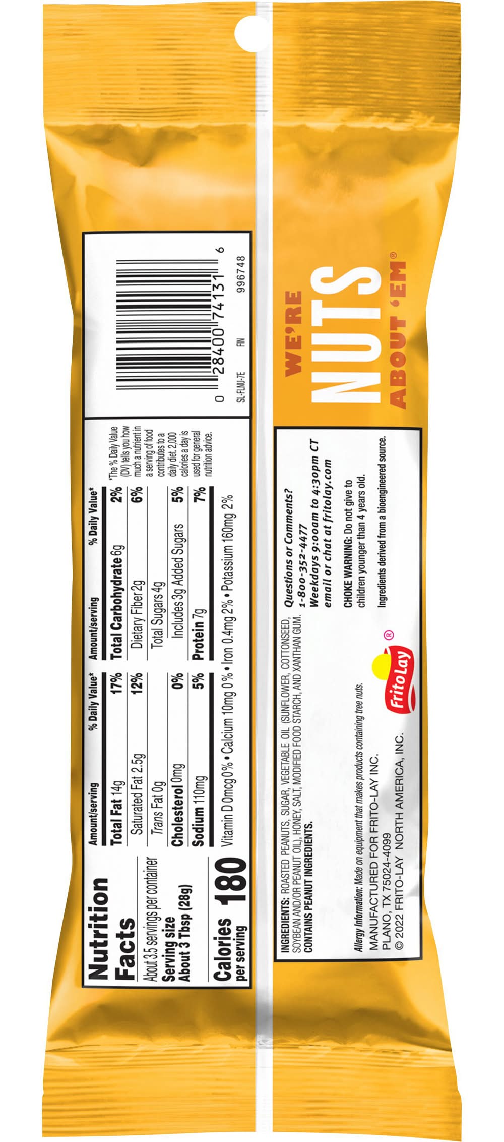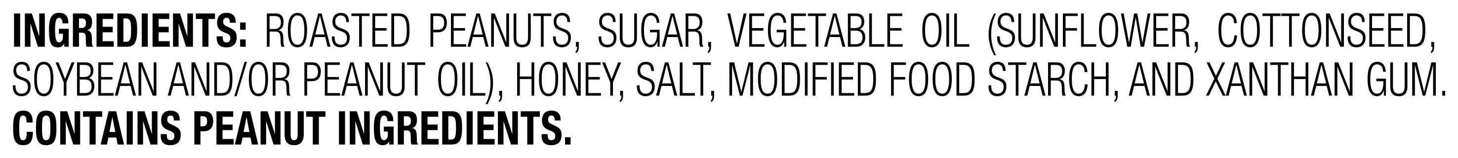 Ingredients: Roasted Peanuts, Sugar, Vegetable Oil (Sunflower, Cottonseed, SOYBEAN And/Or PEANUT Oil), Honey, Salt, Modified Food Starch, And Xanthan Gum. CONTAINS PEANUT INGREDIENTS. Contains: CONTAINS PEANUT INGREDIENTS. ALLERGY INFORMATION: MADE ON EQUIPMENT THAT MAKES PRODUCTS CONTAINING TREE NUTS.