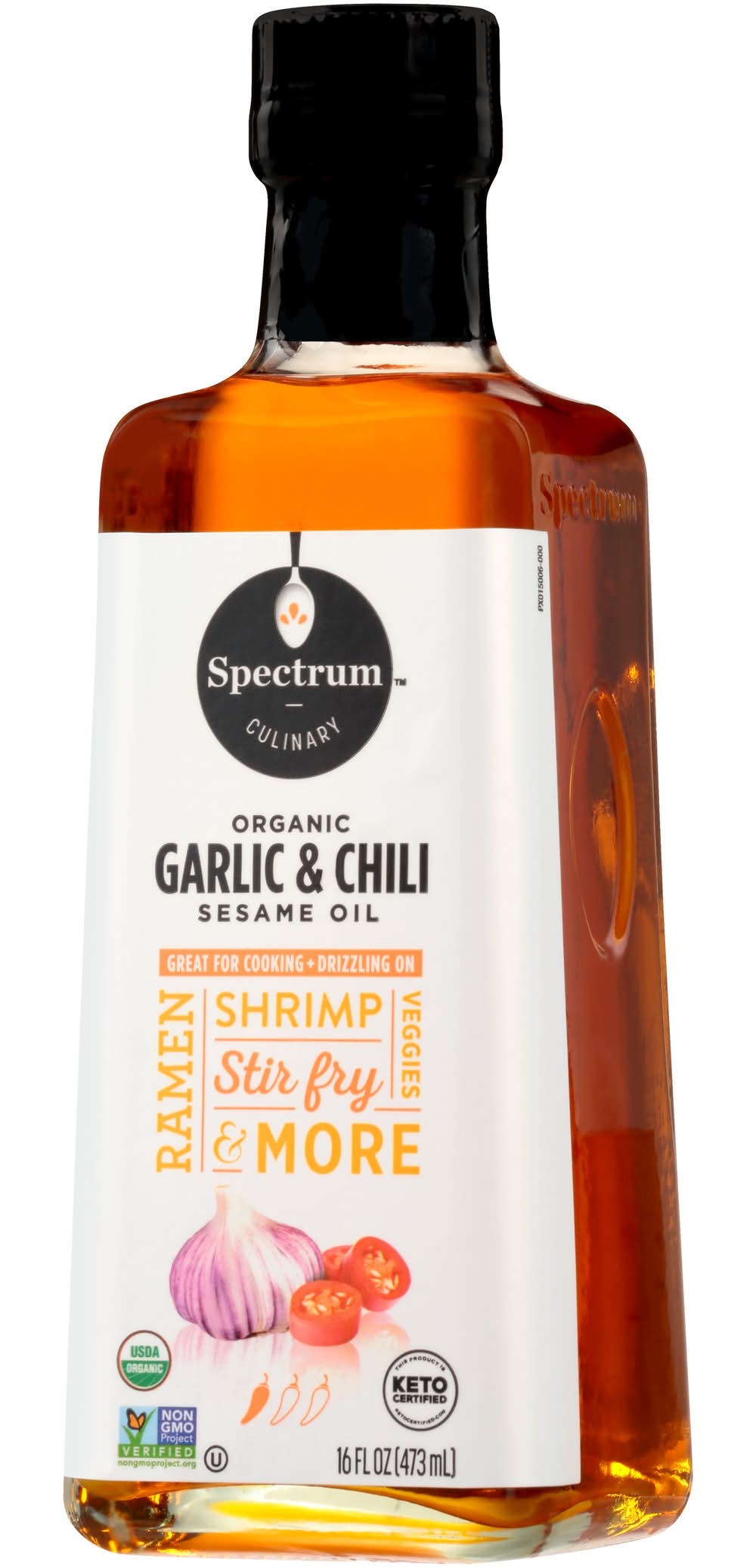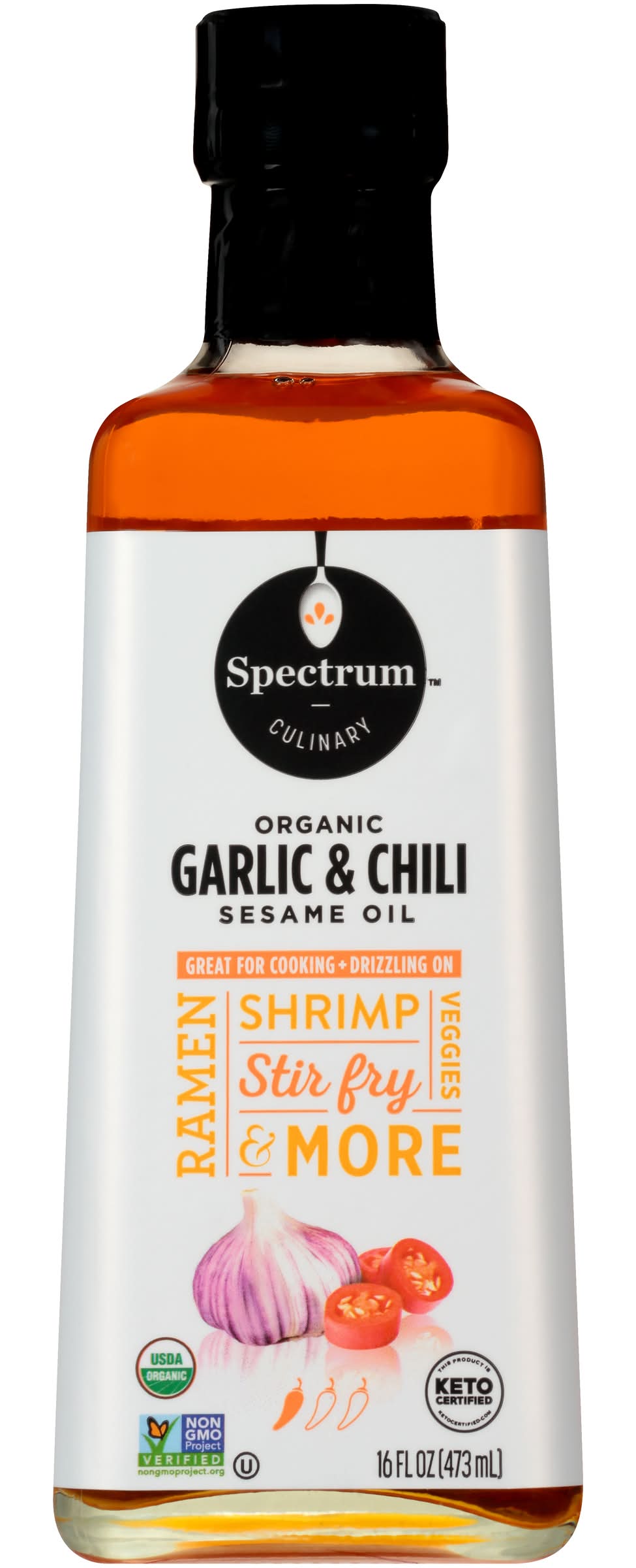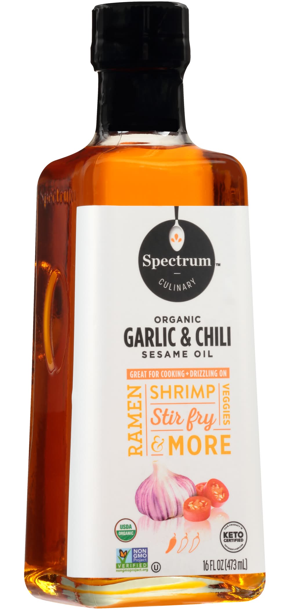USDA Organic. Certified Organic by QAI. This product is Keto Certified. ketocertified.com. Non GMO Project verified. nongmoproject.org. Culinary. Great for cooking + Drizzling On. Ramen, shrimp, veggies, stir fry & more. www.spectrumorganics.com. Oil Product of Mexico. Packaged in the USA The Hain Celestial Group, Inc, Lake Success, NY, 11042