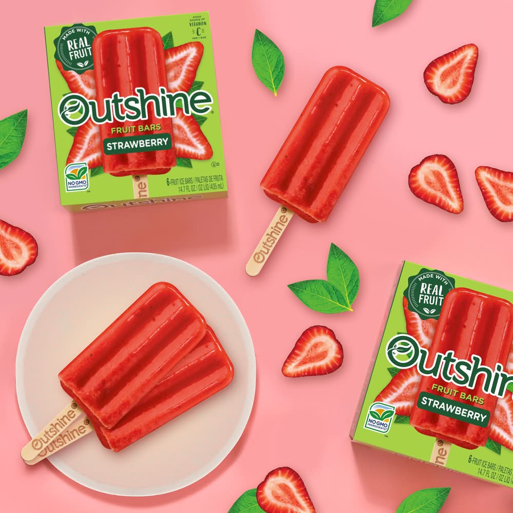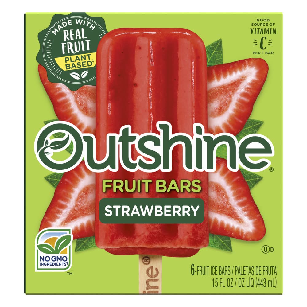 Outshineare a refreshing frozen snack bursting with delicious strawberry flavor. These gluten free Outshine bars are made with real fruit, every bite of these delicious freezer pops tastes like biting into a ripe summertime . Each Outshine frozen fruit bar is made with no GMO ingredients and has no artificial colors, flavors, sweeteners or high fructose corn syrup for a feel-good snack. Enjoy these wholesome fat free Outshine bars any time of day, whether you want a feel-good strawberry snack or need a little afternoon pick-me-up. Snack brighter with Outshine. Try the whole range of to find your new favorite summertime snack or after-dinner delight. Choose from, fruit bars with no sugar added, variety packs, and more. You can even mix and match your favorite Outshine Fruit Bars in a blender (remember to remove the sticks!) to make deliciously refreshing mocktails that are sure to cool down any hot afternoon. With more than a dozen real fruit flavors to choose from including • Flavor: Strawberry • Packaging: Reusable