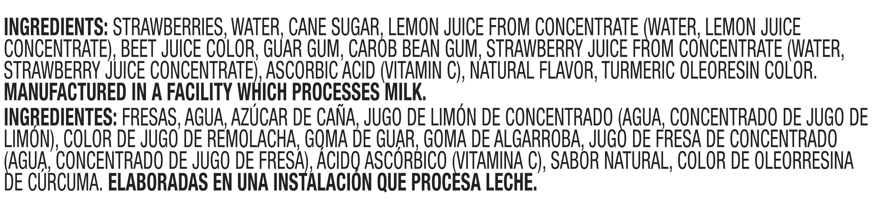 Ingredients: Strawberries, Water, Cane Sugar, Citric Acid, Guar Gum, Carob Bean Gum, Ascorbic Acid (Vitamin C), Strawberry Juice from Concentrate (Water Strawberry Juice Concentrate), Natural Flavor, Beet Juice Color, Turmeric Oleoresin Color Contains: MANUFACTURED IN A FACILITY WHICH PROCESSES MILK.