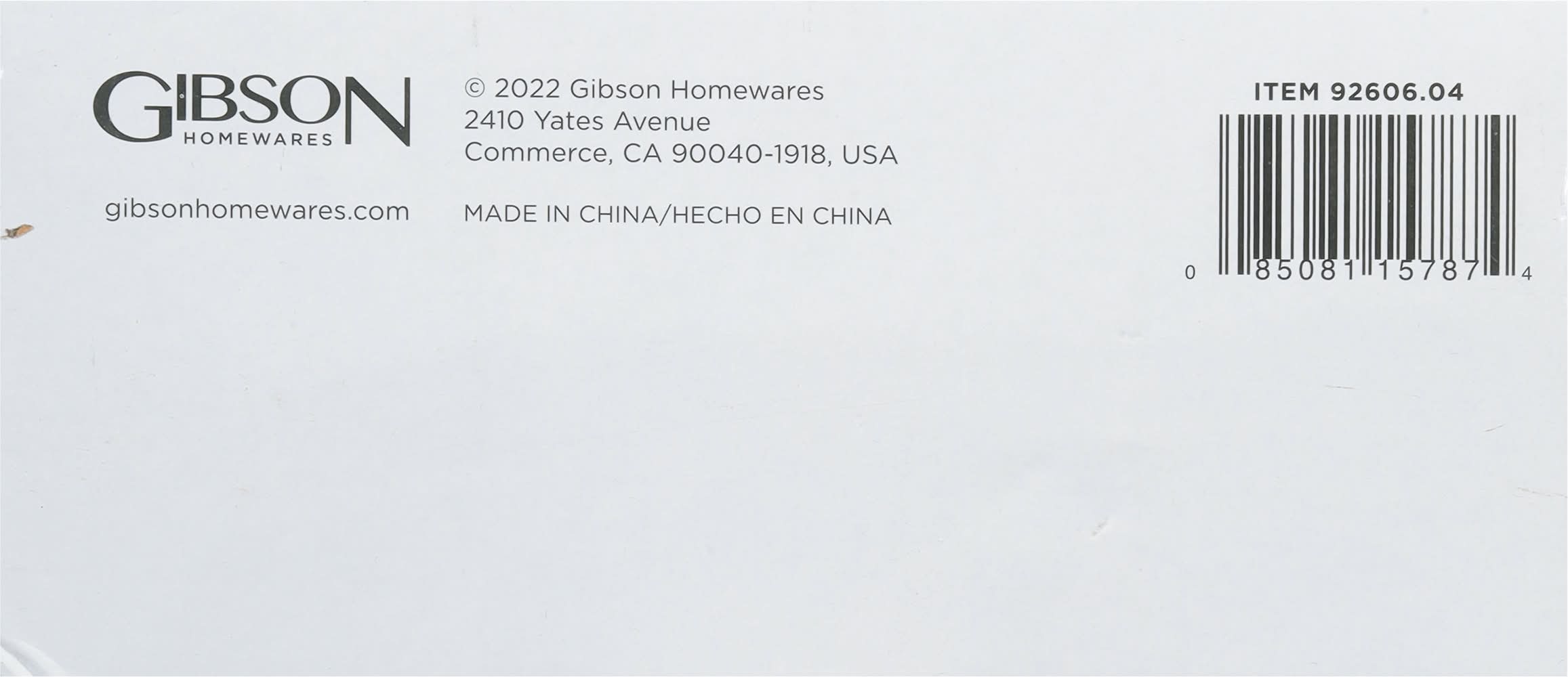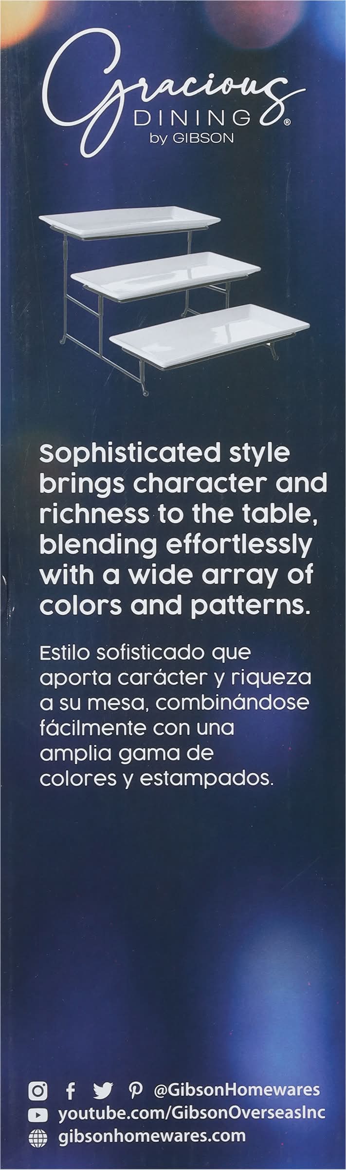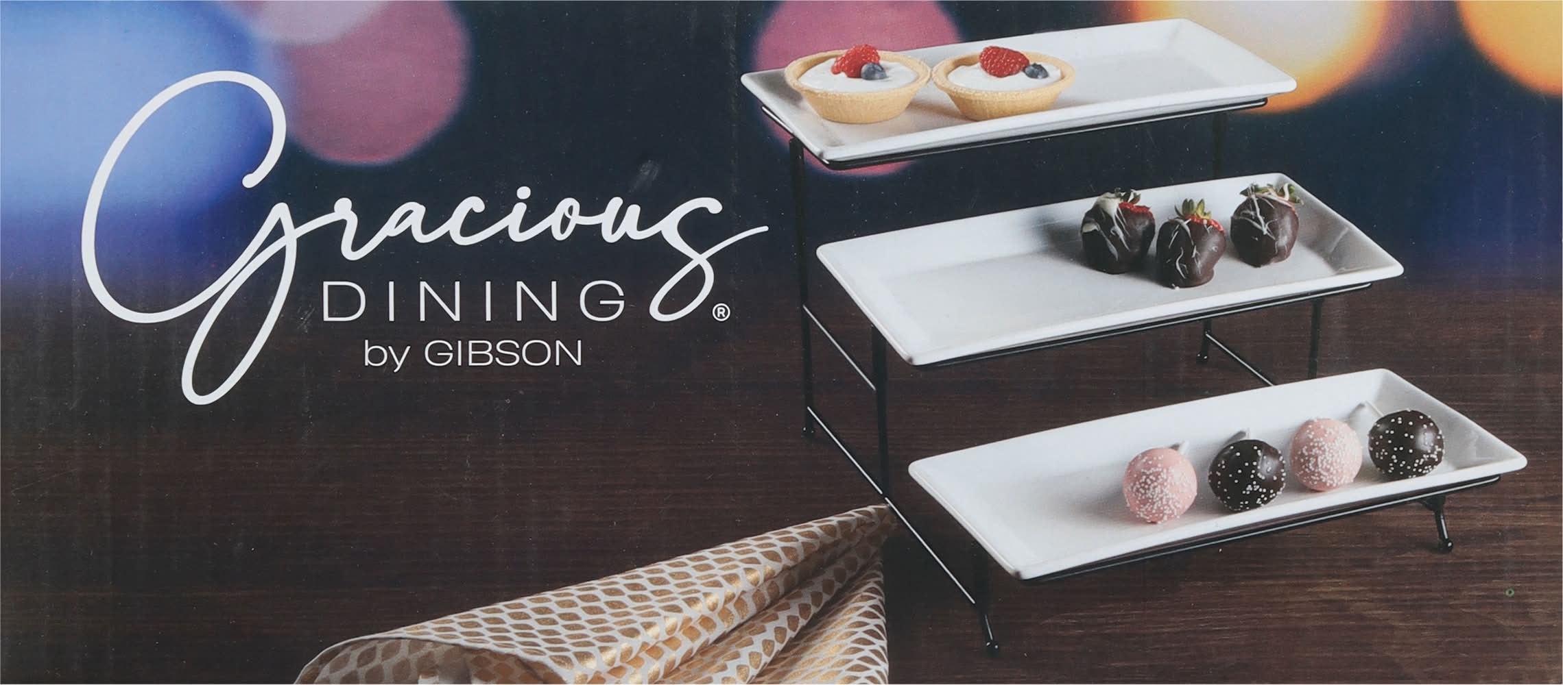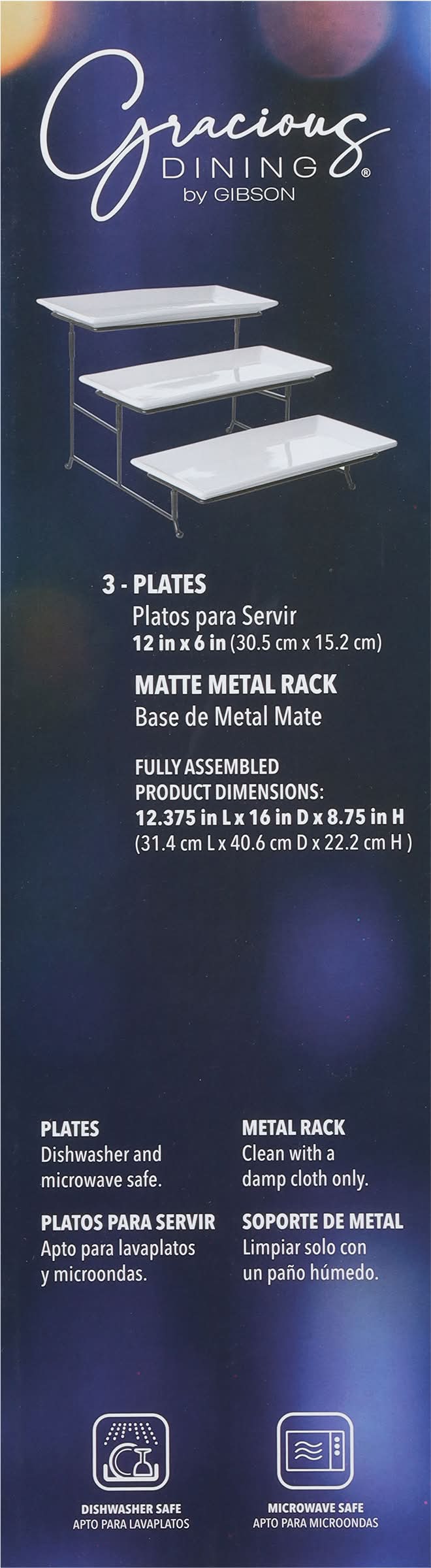 Gracious Dining. By Gibson. Sophisticated style brings character and richness to the table, blending effortlessly with a wide array of colors and patterns. 3 - plates 12 in x 6 in (30.5 cm × 15.2 cm) matte metal rack Fully assembled product dimensions: 12.375 in L x 16 in D x 8.75 in H. Plates dishwasher and microwave safe. Metal rack clean with a damp cloth only. Dishwasher safe. Microwave safe. youtube.com/gibsonoverseasInc. gibsonhomewares.com. Instagram. Facebook. Twitter. Pinterest. (at)GibsonHomewares. Youtube. youtube.com/gibsonoverseasInc. Made in China.