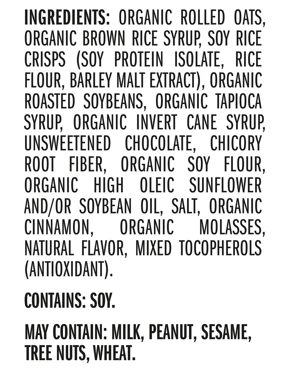 Ingredients: INGREDIENTS: ORGANIC ROLLED OATS, ORGANIC BROWN RICE SYRUP, SOY RICE CRISPS (SOY PROTEIN ISOLATE, RICE FLOUR, BARLEY MALT EXTRACT), ORGANIC ROASTED SOYBEANS, ORGANIC TAPIOCA SYRUP, ORGANIC INVERT CANE SYRUP, UNSWEETENED CHOCOLATE, CHICORY ROOT FIBER, ORGANIC SOY FLOUR, ORGANIC HIGH OLEIC SUNFLOWER AND, OR SOYBEAN OIL, SALT, ORGANIC CINNAMON, ORGANIC MOLASSES, NATURAL FLAVOR, MIXED TOCOPHEROLS (ANTIOXIDANT), . CONTAINS: SOY. MAY CONTAIN: MILK, PEANUT, SESAME, TREE NUTS, WHEAT. Contains: CONTAINS: SOY. MAY CONTAIN: MILK, PEANUT, SESAME, TREE NUTS, WHEAT.