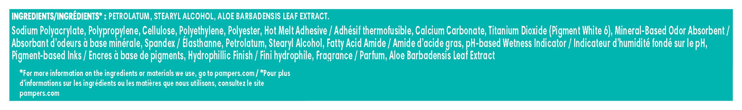Ingredients: *Petrolatum, Stearyl Alcohol, Aloe Barbadensis Leaf Extract, Sodium Polyacrylate, Polypropylene, Cellulose, Polyethylene, Polyester, Hot Melt Adhesive/Adhesif Thermofusible, Calcium Carbonate, Titanium Dioxide (Pigment White 6), Mineral-Based Odor Absorbent/Absorbant D'odeurs a Base Minerale, Spandex/Elasthanne, Petrolatum, Stearyl Alcohol, Fatty Acid Amide/Amide D'acide Gras, pH-Based Wetness Indicator/Indicateur D'humidite Fonde Sur Le pH, Pigment-Based Inks/Encres a Base De Pigments, Hydrophillic Finish/Fini Hydrophile, Fragrance/Parfum, Aloe Barbadensis Leaf Extract, * for More Information on the Ingredients or Materials We Use, Go to Pampers.com
