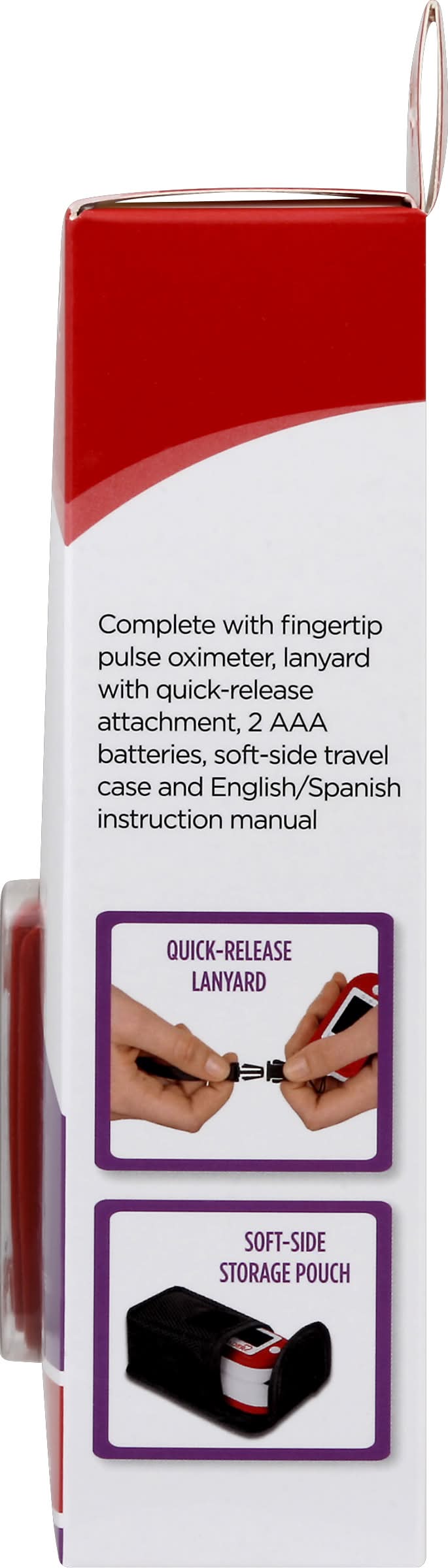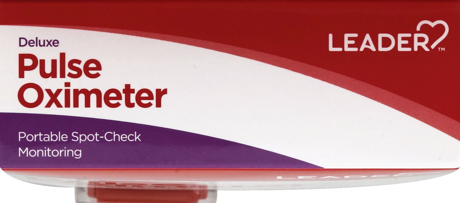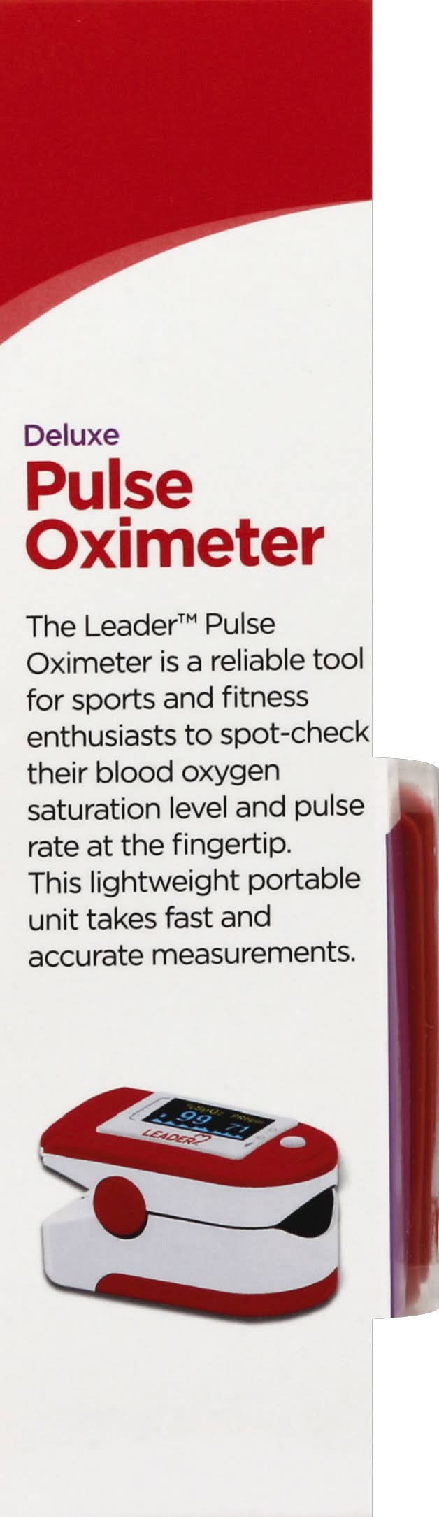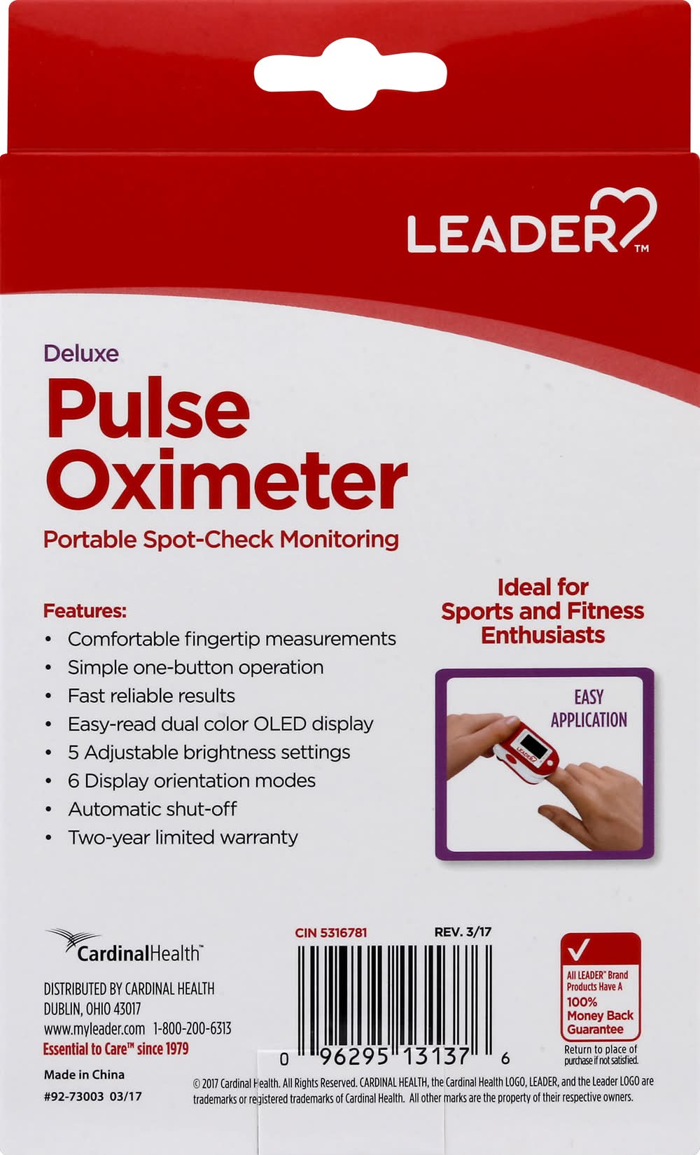 Portable spot-check monitoring. Accurate Measurements: Blood oxygen level; Pulse rate. Multiple uses: Air travel; Sports and recreation; home fitness. Features: Comfortable fingertip measurements; Simple one-button operation; Fast reliable results; Easy-read dual color OLED display; 5 Adjustable brightness settings; 6 Display orientation modes; Automatic shut-off; Two-year limited warranty. Ideal for sports and fitness enthusiasts. Easy applicator. Complete with fingertip pulse oximeter, lanyard with quick-release attachment, 2 AAA batteries, soft-side travel case and English/Spanish instruction manual. The Leader Pulse Oximeter is a reliable tool for sports and fitness enthusiasts to spot-check their blood oxygen saturation level and pulse rate at the fingertip. This lightweight portable unit takes fast and accurate measurements. Essential to care since 1979. www.myleader.com. All Leader brand products have a 100% money back guarantee. Return to place of purchase if not satisfied. Made in China. CARDINAL HEALTH,