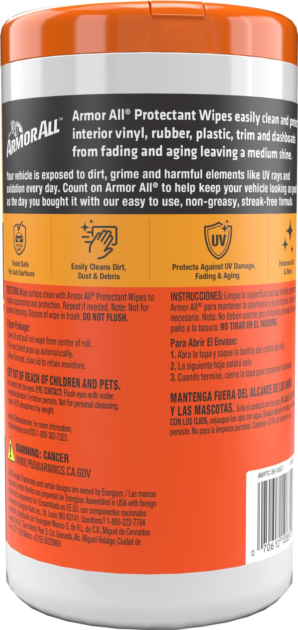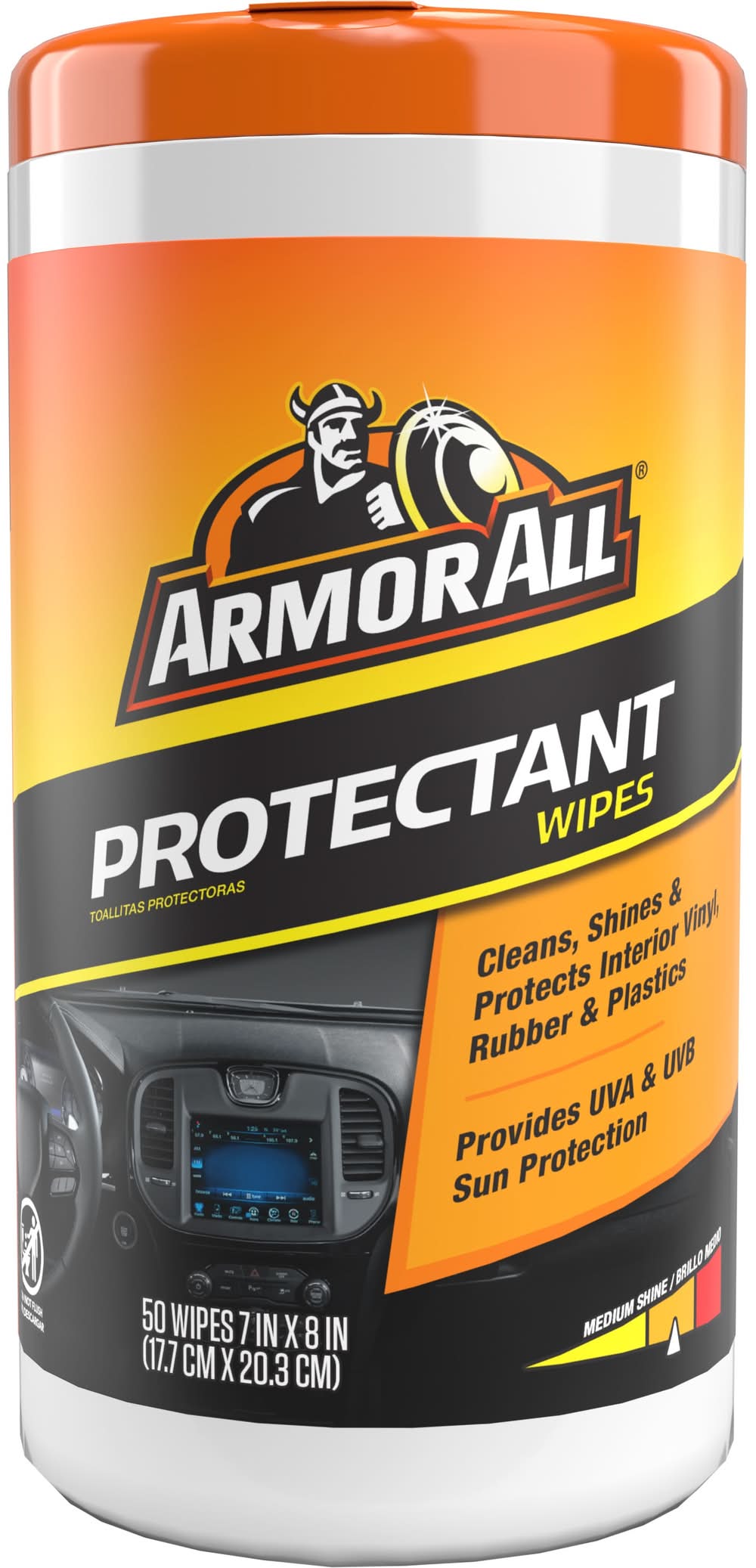 Armor All Original Protectant Wipes (50 count). Proven Armor All Original Protectant in a convenient disposable wipe. Fights aging, fading and cracking. Cleans, shines and protects plastic, vinyl and rubber from UV damage. Helps keep surfaces looking like new with a medium shine finish. Disposable wipes are lint‐free. For CA Residents Only: WARNING: This product can expose you to chemicals including Lead which are known to the State of California to cause cancer and birth defects or other reproductive harm. For more information go to www.P65Warnings.ca.gov.