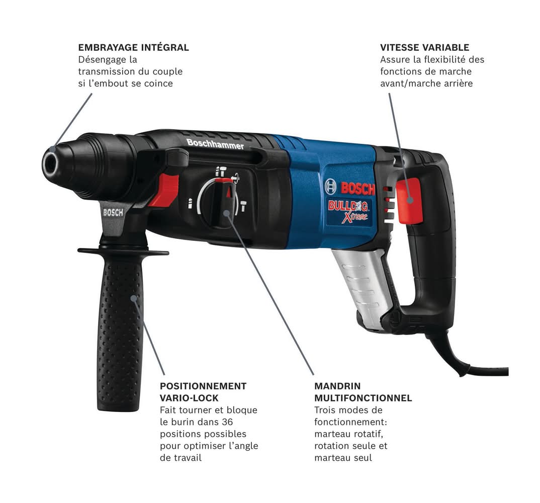 Robust 8.0 Amp rotary hammer – delivers 2.0 Ft-Lbs of impact energy with three modes of operation and rotating chisel lock. Vario-Lock positioning – rotates and locks chisel to optimize working angle. Variable-speed trigger with reversing – offers accurate bit starting. Integral clutch – disengages torque transmission if the bit gets into a bind-up scenario. Works with Bosch PRO+GUARD™ dust solutions – an end-to-end dust-collection system that helps users move toward OSHA silica table 1 dust compliance. Multi-function selector – three modes of operation: rotary hammer, rotation only and hammer only. Bosch-exclusive rotating brush plate — provides equal power in forward and reverse. HammerHook – allows quick tool storage during the job. D-handle design – ideal for overhead and downward drilling applications. Color: Black