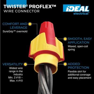 Speed up your splicing with the red/yellow Twister ProFLEX from IDEAL Electrical - the wire connector engineered for premium performance and comfort. The soft extended opening provides extra protection for the conductors and flexes to squeeze into tight boxes easily. Designed to support an impressive wire range from #22 - #8 AWG, the Twister ProFLEX accommodates anything from two #18 AWG to four #10 AWG wires. This connector is also rated for 1000V - th Cancer and Reproductive Harm - www.P65Warnings.ca.gov Color: Red-yellow