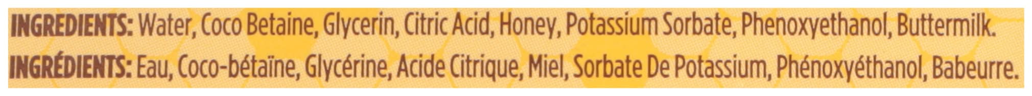 Water, Coco Betaine, Glycerin, Citric Acid, Honey, Potassium Sorbate, Phenoxyethanol, Buttermilk Contains: Milk