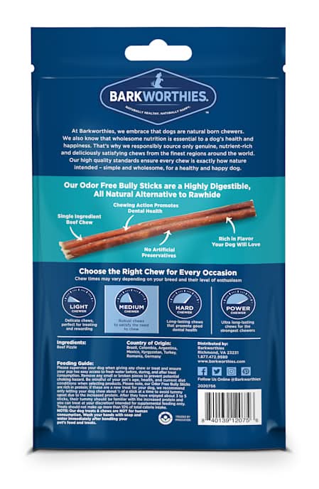 Barkworthies Odor Free Standard Bully Sticks are virtually odor-free and highly digestible, making them a great alternative to a traditional rawhide. As with all our Bully Sticks, they're a great way to give your dog an all-natural chew he's sure to love! Barkworthies Odor Free Standard 6'' Bully Sticks are an excellent size for small to medium dogs and stand up to aggressive chewers for a long time. Their unique shape and texture help promote dental health and encourage pleasant breath. Most Barkworthies' all-natural dog treats and chews are completely preservative-free and additive-free. Please note that this product is not for human consumption. Please supervise your pet while giving a treat or chew and dispose of properly if it becomes a choking hazard or develops sharp edges. Suitable forsmall and medium size dogs, All natural, 100% beef dog chew, Made from free-range, grass feed catttle, 100% digestable dog chew, Packaged in a convenient bag. Size: 4"