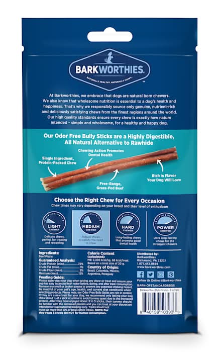 Barkworthies Odor Free Standard Bully Sticks are virtually odor-free and highly digestible, making them a great alternative to a traditional rawhide. As with all our Bully Sticks, they're a great way to give your dog an all-natural chew he's sure to love! Barkworthies Odor Free Standard 6'' Bully Sticks are an excellent size for small to medium dogs and stand up to aggressive chewers for a long time. Their unique shape and texture help promote dental health and encourage pleasant breath. Most Barkworthies' all-natural dog treats and chews are completely preservative-free and additive-free. Please note that this product is not for human consumption. Please supervise your pet while giving a treat or chew and dispose of properly if it becomes a choking hazard or develops sharp edges. Suitable forsmall and medium size dogs, All natural, 100% beef dog chew, Made from free-range, grass feed catttle, 100% digestable dog chew, Packaged in a convenient bag. Size: 4"