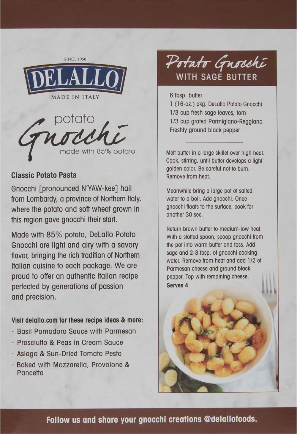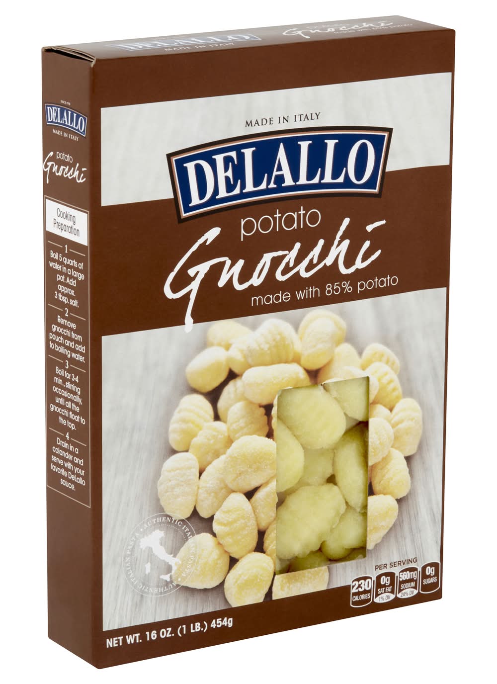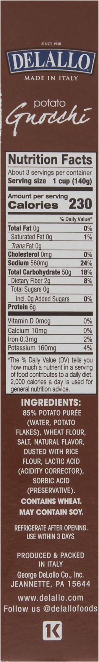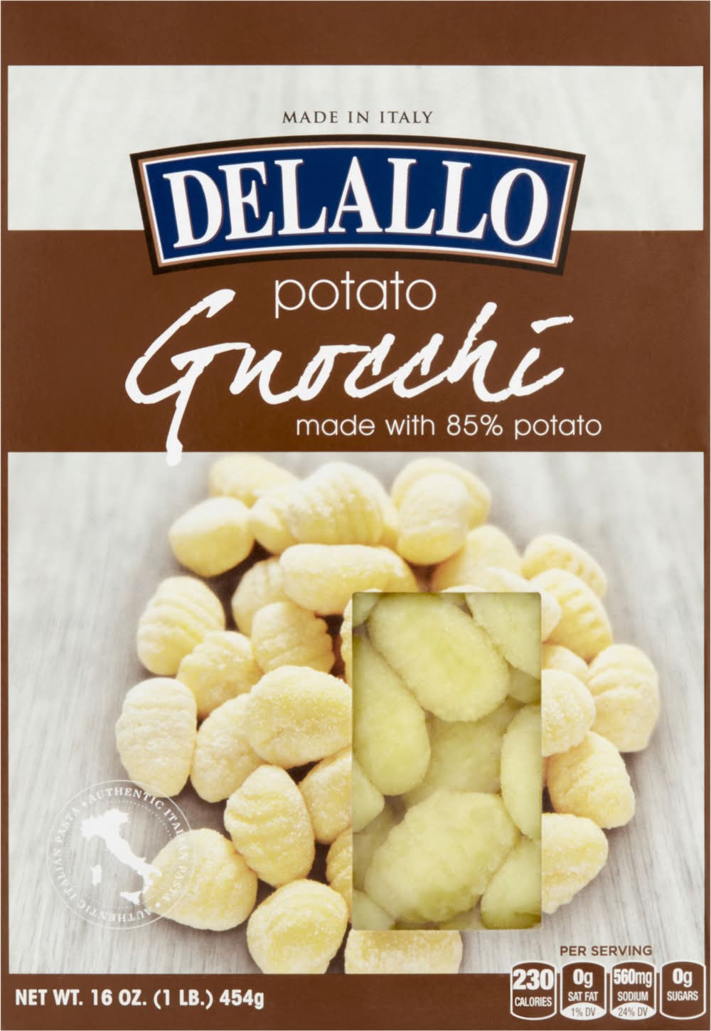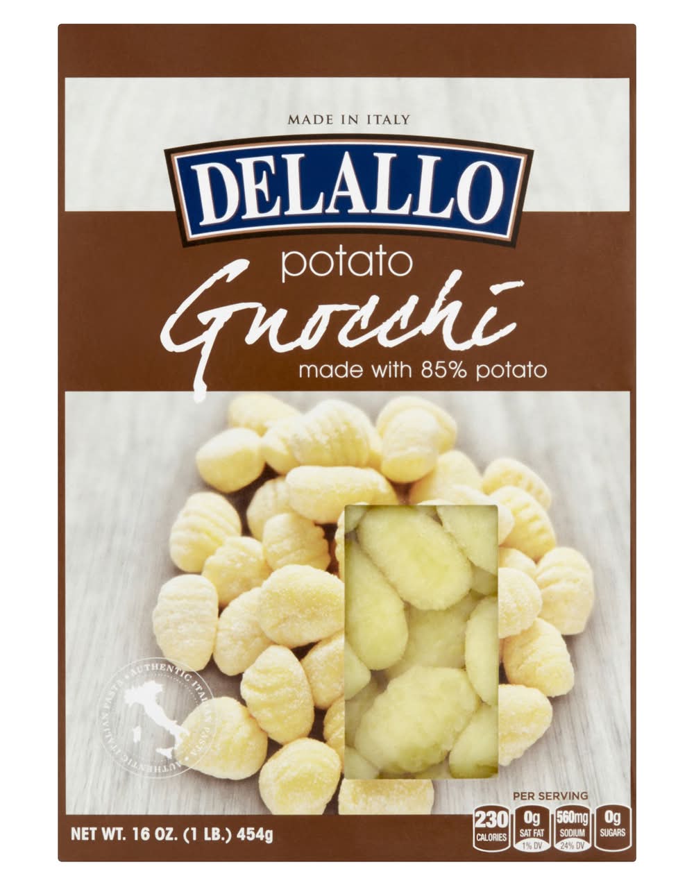 Authentic Italian pasta. Per Serving: 230 calories; 0 g sat fat (1% DV); 560 mg sodium (24% DV); 0 g sugars. Since 1950. Classic Potato Pasta. Gnocchi [pronounced n'yaw-kee] hail from Lombardy, a province of Northern Italy, where the potato and soft wheat grown in this region gave gnocchi their start. Made with 85% potato, DeLallo Potato Gnocchi are light and airy with a savory flavor, bringing the rich tradition of Northern Italian cuisine to each package. We are proud to offer an authentic Italian recipe perfected by generations of passion and precision. George DeLallo Co., Inc., Jeannette, PA, 15644