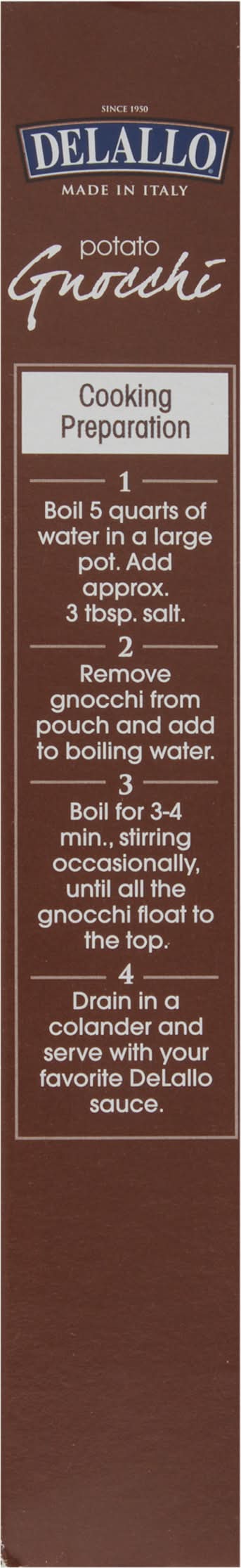 Directions for use: Cooking preparation: 1. Boil 4 quarts of water in a large pot, add approx 1 tbsp, salt. 2. Remove gnocchi from pouch and add to boiling water. 3. Boil for 3-4 min, stirring occasionally, until all the gnocchi float to the top. 4. Drain in a colander and serve with your favorite DeLallo sauce. Refrigerate after opening. Use within 3 days. Storage recommendation: Refrigerate after opening.