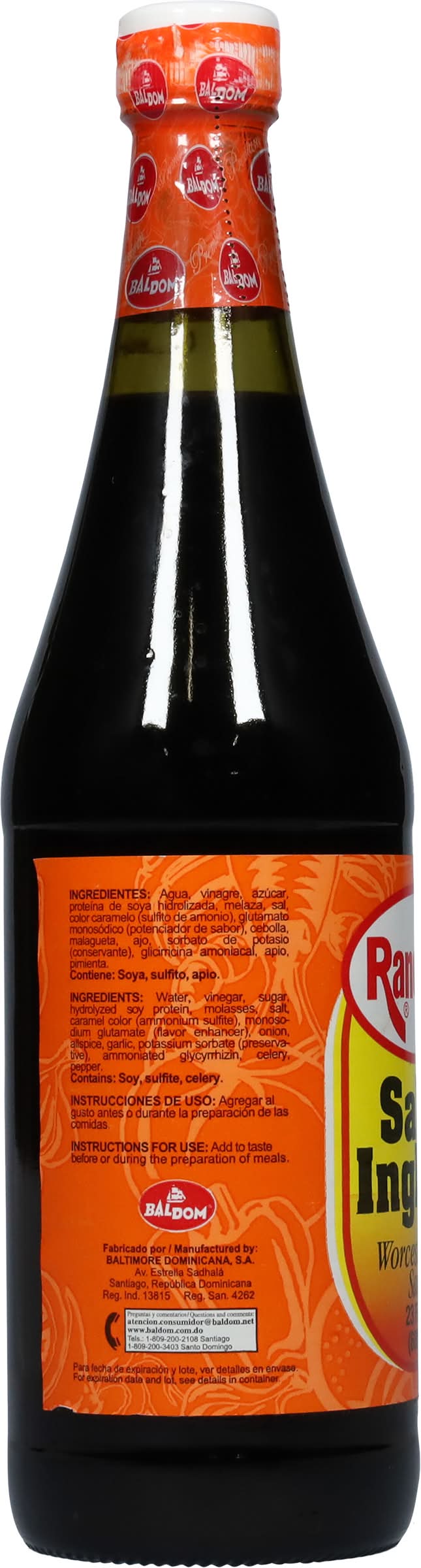 Water, Vinegar, Sugar, Hydrolyzed Soy Protein, Molasses, Salt, Caramel Color (Ammonium Sulfite), Monosodium Glutamate (Flavor Enhancer), Onion, Allspice, Garlic, Potassium Sorbate (Preservative), Ammoniated Glyccrhizin, Celery, Pepper. Contains: Soybeans, Sulfites, Celery