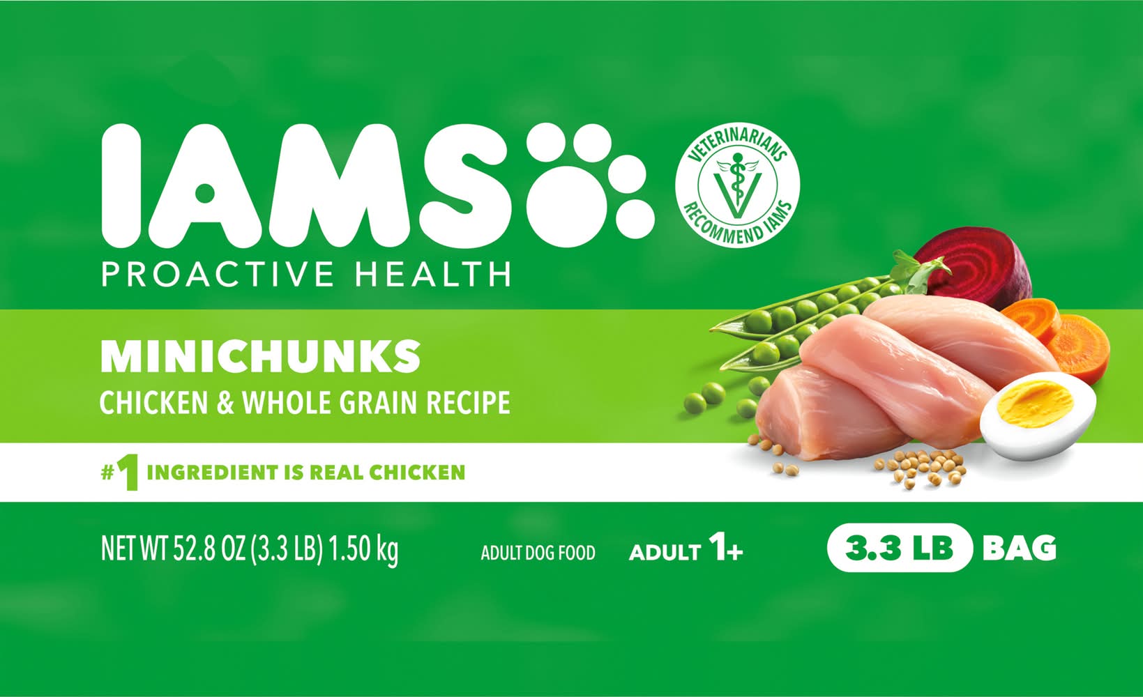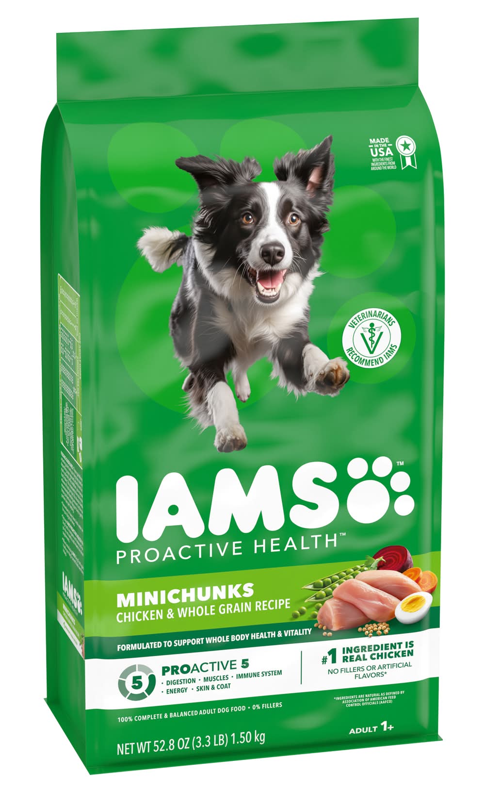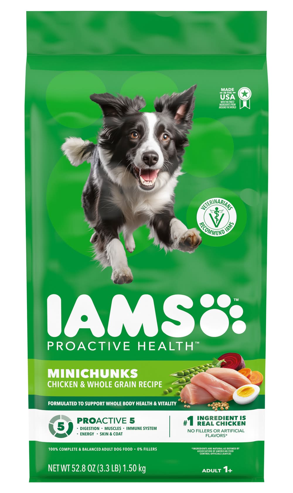 Veterinarians recommend IAMS. Supports the vibrant, whole-body health of adult dogs. Supports whole body health with essential nutrients & antioxidants. Healthy digestion with natural fiber & prebiotics. 100% Complete & balanced adult dog food 0% fillers. No. 1 ingredients is chicken. Why IAMS Proactive Health Minichunks Recipe? Not all dogs are the same, so why feed them the same generic food? The IAMS brand understands that adult dogs have unique needs, too. That’s why we’ve crafted our IAMS Proactive Health Minichunks recipe with a tailored blend of natural fiber and prebiotics to support healthy digestion, and high quality protein to promote strong muscles. With this premium tailored recipe, you can be confident that your do will always be their best, today and every day. Look for the IAMS difference. Healthy Skin and Coat: Omega 6 fatty acids for healthy skin & coat. Healthy Digestion: Tailored blend of natural fiber & prebiotics for healthy digestion. Strong Muscles: Supports strong, firm muscles with protein sourced from chicken and egg. Strong Immune System: Enriched with antioxidants to help maintain a strong immune system. Healthy Energy: Wholesome grains provide essential nutrients & carbohydrates for healthy energy. Healthy Teeth: Crunchy kibbles scrub your dog’s teeth with every bite, to help reduce plaque buildup that can lead to bad breath. Made with Real Wholesome Ingredients: Farm-Raised Chicken: Helps to maintain strong, healthy muscles. Wholesome Grains: Provide essential nutrients & carbohydrates for healthy energy. Garnish of Carrots: Includes farm-grown carrots. Chicken Fat: Omega-6 fatty acids helps support healthy skin and coat. Beef Pulp: With natural fiber & probiotics for healthy digestion. Pet food only. • Size: Adult • Mars Petcare US, Franklin, TN, 37067