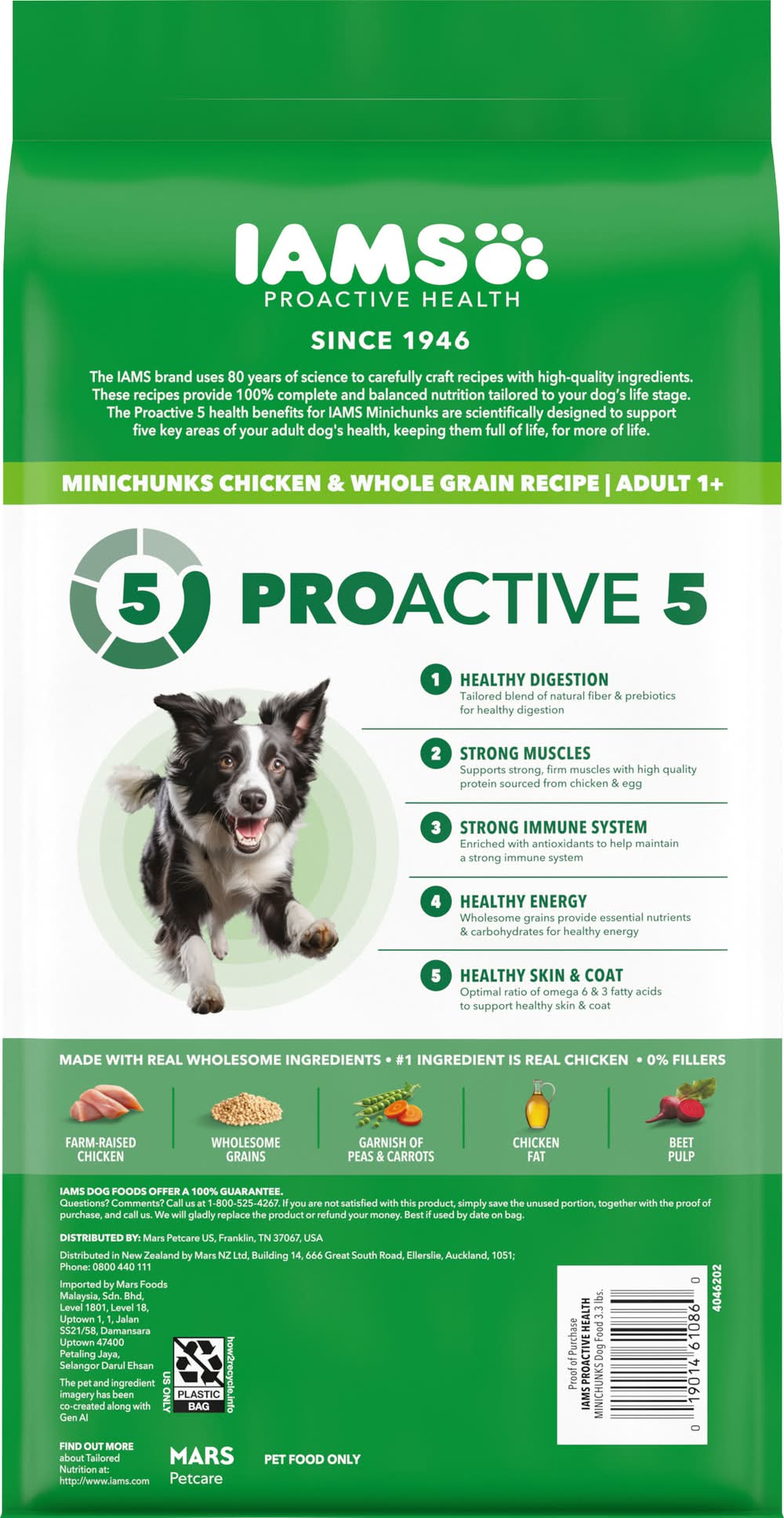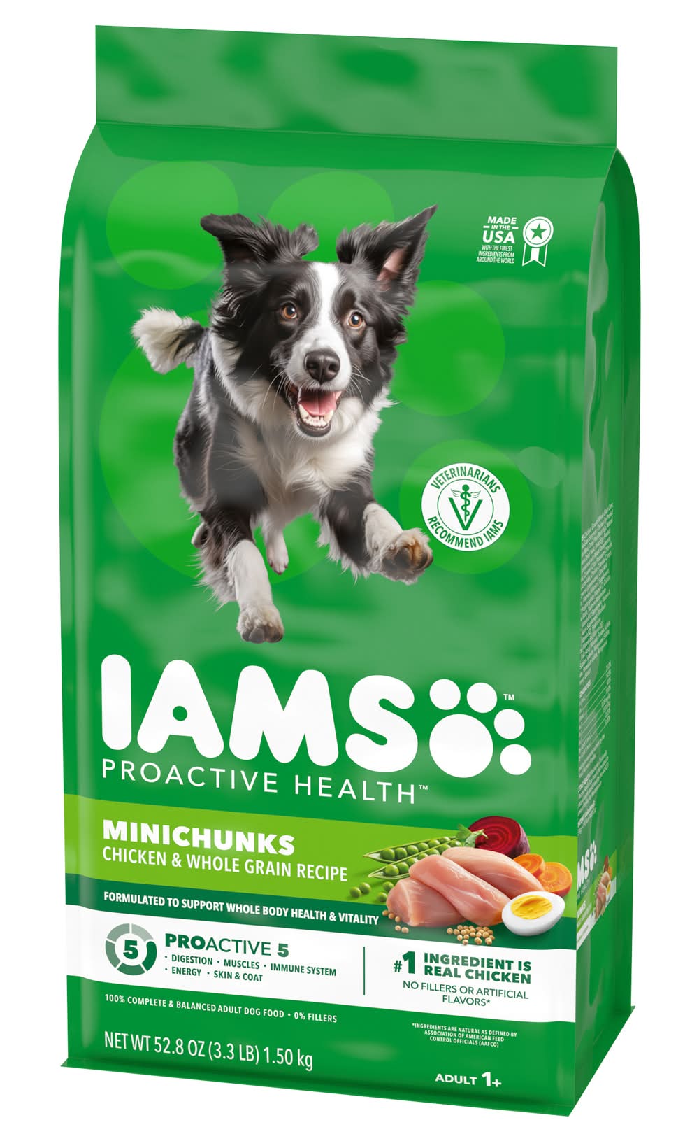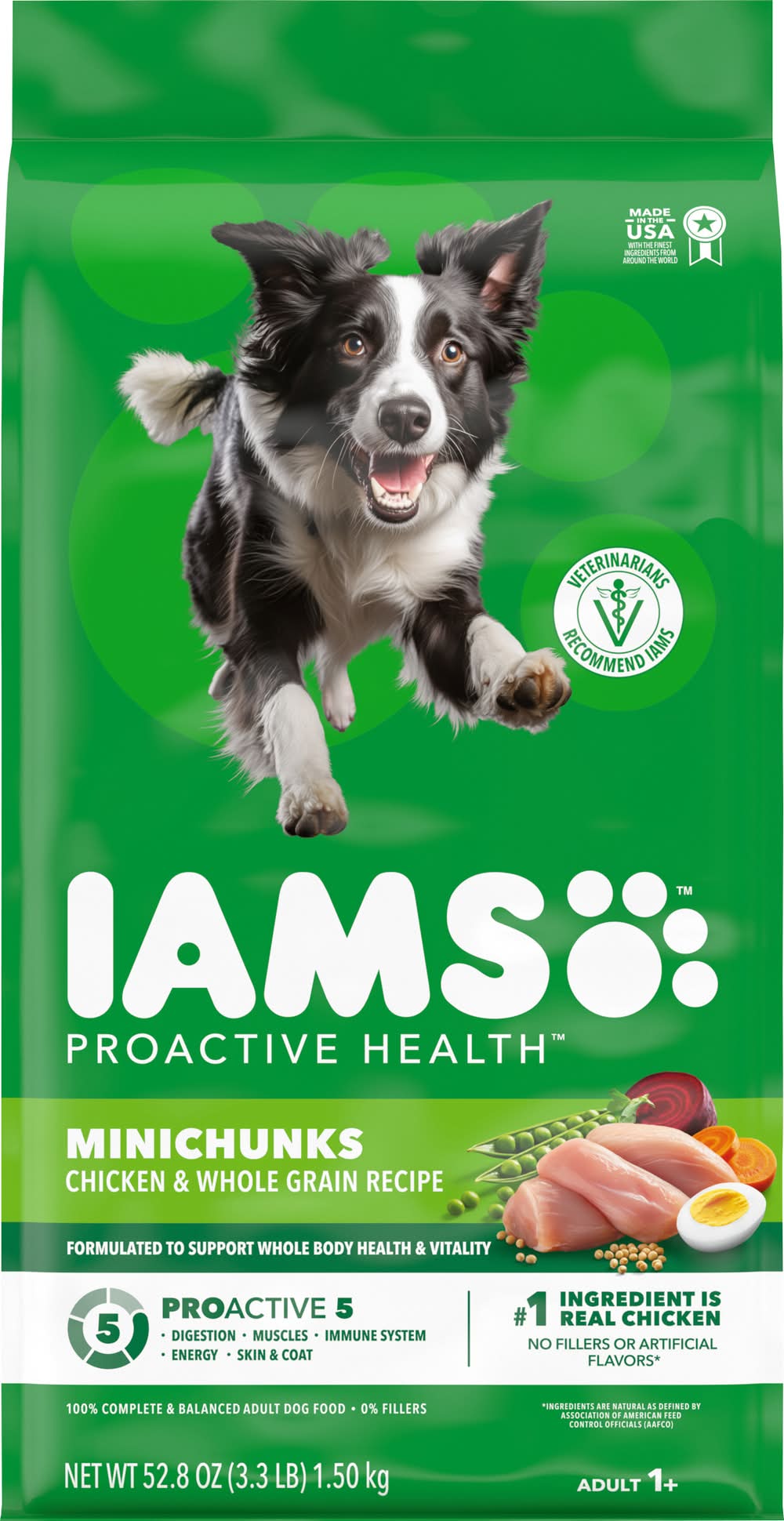 Veterinarians recommend IAMS. Supports the vibrant, whole-body health of adult dogs. Supports whole body health with essential nutrients & antioxidants. Healthy digestion with natural fiber & prebiotics. 100% Complete & balanced adult dog food 0% fillers. No. 1 ingredients is chicken. Why IAMS Proactive Health Minichunks Recipe? Not all dogs are the same, so why feed them the same generic food? The IAMS brand understands that adult dogs have unique needs, too. That’s why we’ve crafted our IAMS Proactive Health Minichunks recipe with a tailored blend of natural fiber and prebiotics to support healthy digestion, and high quality protein to promote strong muscles. With this premium tailored recipe, you can be confident that your do will always be their best, today and every day. Look for the IAMS difference. Healthy Skin and Coat: Omega 6 fatty acids for healthy skin & coat. Healthy Digestion: Tailored blend of natural fiber & prebiotics for healthy digestion. Strong Muscles: Supports strong, firm muscles with protein sourced from chicken and egg. Strong Immune System: Enriched with antioxidants to help maintain a strong immune system. Healthy Energy: Wholesome grains provide essential nutrients & carbohydrates for healthy energy. Healthy Teeth: Crunchy kibbles scrub your dog’s teeth with every bite, to help reduce plaque buildup that can lead to bad breath. Made with Real Wholesome Ingredients: Farm-Raised Chicken: Helps to maintain strong, healthy muscles. Wholesome Grains: Provide essential nutrients & carbohydrates for healthy energy. Garnish of Carrots: Includes farm-grown carrots. Chicken Fat: Omega-6 fatty acids helps support healthy skin and coat. Beef Pulp: With natural fiber & probiotics for healthy digestion. Pet food only. • Size: Adult • Mars Petcare US, Franklin, TN, 37067