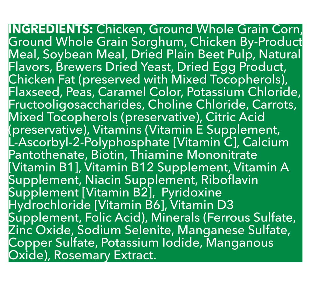 Ingredients: Chicken, Ground Whole Grain Corn, Ground Whole Grain Sorghum, Chicken By-Product Meal, Soybean Meal, Dried Plain Beet Pulp, Natural Flavors, Brewers Dried Yeast, Dried Egg Product, Chicken Fat (Preserved with Mixed Tocopherols), Flaxseed, Peas, Caramel Color, Potassium Chloride, Fructooligosaccharides, Choline Chloride, Carrots, Mixed Tocopherols (Preservative), Citric Acid (Preservative), Vitamins (Vitamin E Supplement, L-Ascorbyl-2-Polyphosphate [Vitamin C], Calcium Pantothenate, Biotin, Thiamine Mononitrate [Vitamin B1], Vitamin B12 Supplement, Vitamin a Supplement, Niacin Supplement, Riboflavin Supplement [Vitamin B2], Pyridoxine Hydrochloride [Vitamin B6], Vitamin D3 Supplement, Folic Acid), Minerals (Ferrous Sulfate, Zinc Oxide, Sodium Selenite, Manganese Sulfate, Copper Sulfate, Potassium Iodide, Manganous Oxide), Rosemary Extract Contains: Soybeans, Eggs