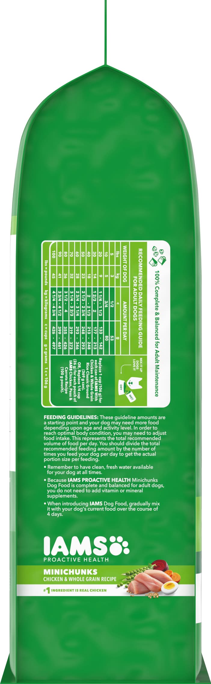 Best if used by date on bag. 100% complete & balanced for adult maintenance. recommended daily feeding guide for adult dogs: weight of dog: 5 lbs (3 kg); amount per day: 1/2 cup (52 g). weight of dog: 10 lbs (5 kg); amount per day: 3/4 cups (78 g). weight of dog: 20 lbs (9 kg); amount per day: 1-1/4 - 1-1/2 cups (130 - 156 g). weight of dog: 30 lbs (14 kg); amount per day: 1-2/3 - 2 cups (173 – 208 g). weight of dog: 40 lbs (18 kg); amount per day: 2 - 2-1/3 cups (208 - 243 g). weight of dog: 50 lbs (23 kg); amount per day: 2-1/2 - 2-3/4 cups (260 - 286 g). lbs = pounds; kg = kilograms; c = cups; g = grams; 1 c = 104 g. mix it up; dogs love it. replace 1 cup (104 g) for each can of iams chicken and rice (369g can). feeding guidelines: these guideline amounts are a starting point of your dog may need more food depending upon age, activity and temperament. in order to reach optimal body condition, you may need to adjust food intake. this represents the total recommended volume of food per day. you should divide the total recommended feeding amount by the number of times you feed your dog per day to get the actual portion size per feeding. remember to have clean, fresh water available for your dog at all times. because iams proactive health minichunks dog food is complete and balanced for adult dogs, you do not need to add vitamin or mineral supplements. when introduced iams dog food, gradually mix it with your dog's current food over the course of 4 days.