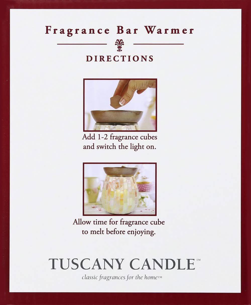 (1) place 1 to 2 fragrance cubes in warmer bowl and turn electric switch on. (2) enjoy the refreshing scent of the melted fragrance cubes. (3) to recycle fragrance cubes, turn off warmer and let dish and wax cool prior to handling. place dish in freezer for several minutes. wax disc will release from dish. let dish get to room temperature before using again. the tuscany fragrance bar warmer allows you to enjoy beautiful, continuous fragrance in your home - conveniently, safely, and with no flame! wax fragrance bars are gently melted using a low wattage light bulb. the bulb also casts soft, romantic illumination through the small openings in the warmer. the unique design of this warmer makes it as decorative as it is functional-adding worm and fragrant ambiance to any room. for use with our wax fragrance bars, offered in variety of refreshing scents that will create the perfect mood and captivate your senses! fragrance bars not included. directions: add 1-2 fragrance cubes and switch the light on. allow time for fragrance cube to melt before enjoying.