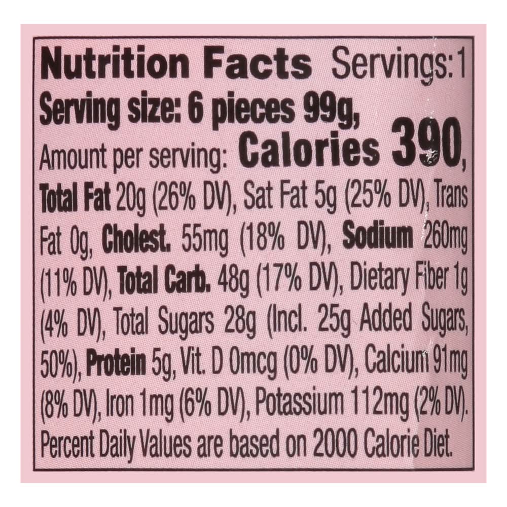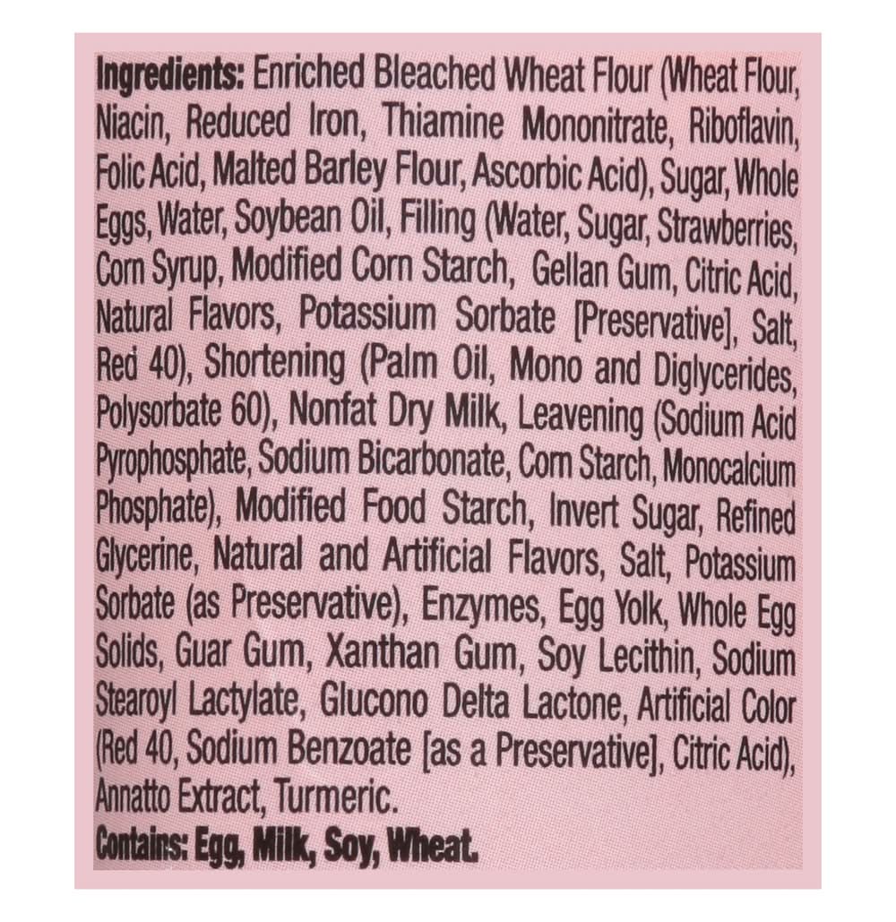 Ingredients: Enriched Bleached Wheat Flour (Wheat Flour, Niacin, Reduced Iron, Thiamine Mononitrate, Riboflavin, Folic Acid, Malted Barley Flour, Ascorbic Acid), Sugar, Whole Eggs, Water, Soybean Oil, Filling (Water, Sugar, Strawberries, Corn Syrup, Modified Corn Starch, Gellan Gum, Citric Acid, Natural Flavors, Potassium Sorbate [Preservative], Salt, Red 40), Shortening (Palm Oil, Mono and Diglycerides, Polysorbate 60), Nonfat Dry Milk, Leavening (Sodium Acid Pyrophosphate, Sodium Bicarbonate, Corn Starch, Monocalcium Phosphate), Modified Food Starch, Invert Sugar, Refined Glycerine, Natural and Artificial Flavors, Salt, Potassium Sorbate (as Preservative), Enzymes, Egg Yolk, Whole Egg Solids, Guar Gum, Xanthan Gum, Soy Lecithin, Sodium Stearoyl Lactylate, Glucono Delta Lactone, Artificial Color (Red 40, Sodium Benzoate [as a Preservative], Citric Acid), Annatto Extract, Turmeric Contains: Wheat, Barley, Eggs, Soybeans, Corn, Milk