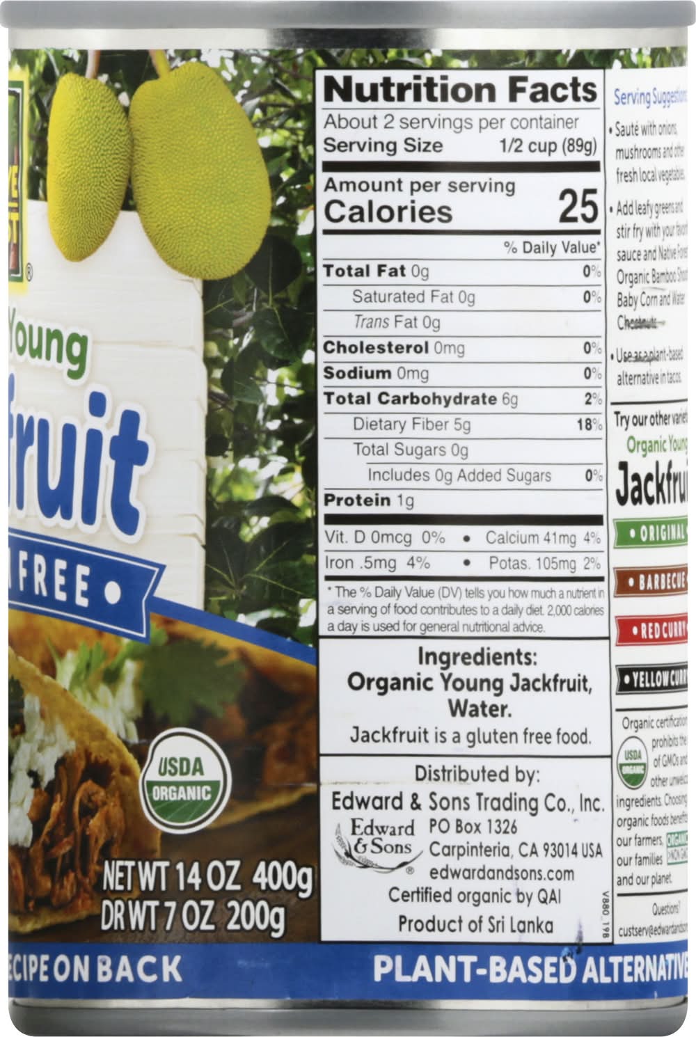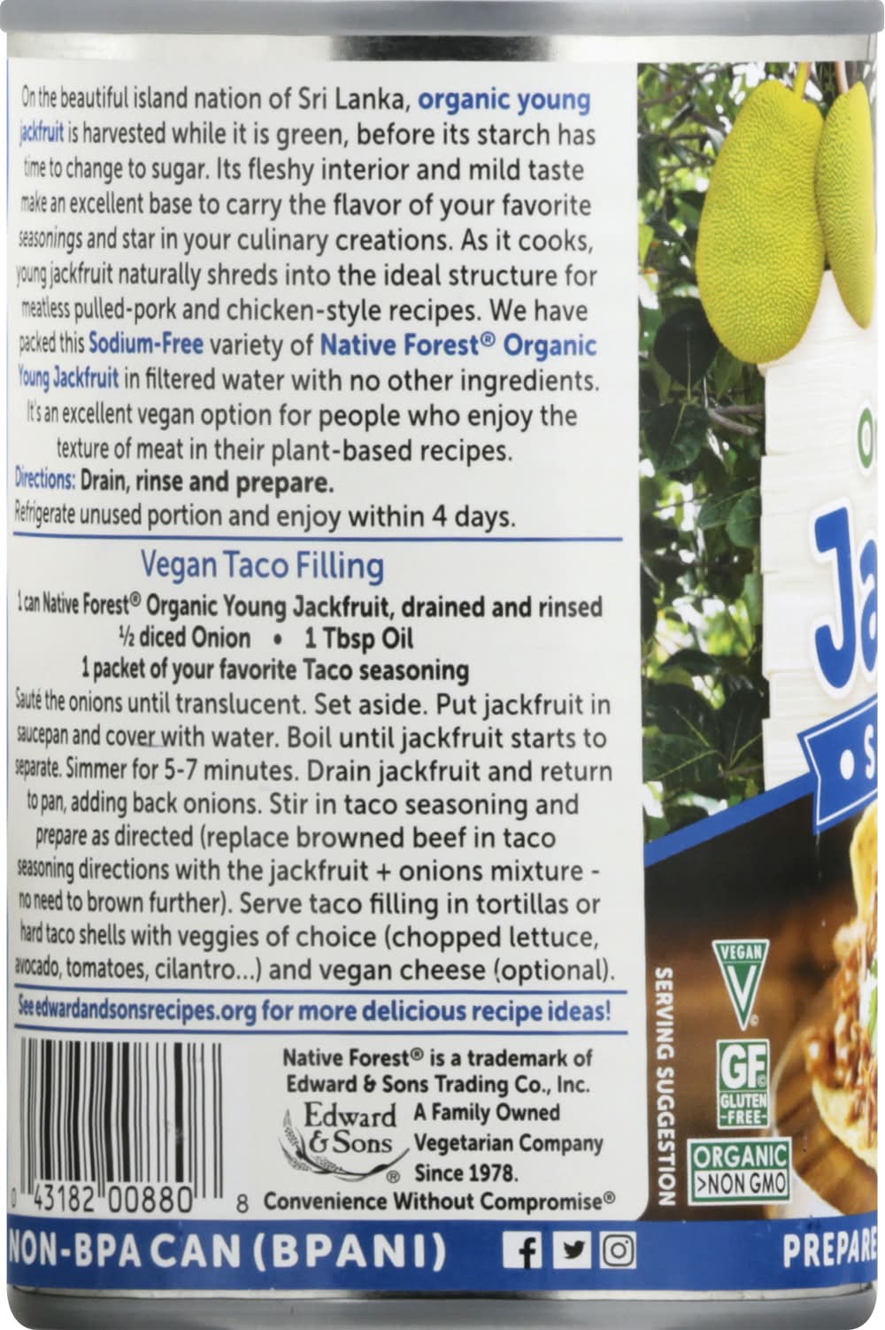 Dr wt 7 oz (200 g). Sodium free. Gluten free. Jackfruit is a gluten free food. Vegan. USDA Organic. Organic. Organic certification prohibits the use of GMOs and other unwelcome ingredients. Choosing organic foods benefits our farmers, our families and our planet. Certified Organic by QAI. Non GMO. Prepare & serve. Recipe on back. On the beautiful island nation of Sri Lanka, Organic Young Jackfruit is harvested while it is green, before its starch has time change to sugar. Its fleshy interior and mild taste make an excellent base to carry the flavor of your favorite seasonings and star in your culinary creations. As it cooks, young jackfruit naturally shreds into the ideal structure for meatless pulled-pork and chicken-style recipes. We have packed this Sodium-Free variety of Native Forest Organic Young Jackfruit in filtered water with no other ingredients. It’s an excellent vegan option for people who enjoy the texture of meat in their plant-based recipes. A family owned vegetarian company. Since 1978. Convenience without compromise. Plant-based alternative. edwardandsonsrecipes.org. Facebook. Twitter. Instagram. See edwardandsonsrecipes.org for more delicious recipe ideas! Questions? custserv(at)edwardandsons.com. Try our other varieties: Organic Young Jackfruit original, barbecue, red curry, yellow curry. Non-BPA can (BPANI). Product of Sri Lanka. Edward & Sons Trading Co,
