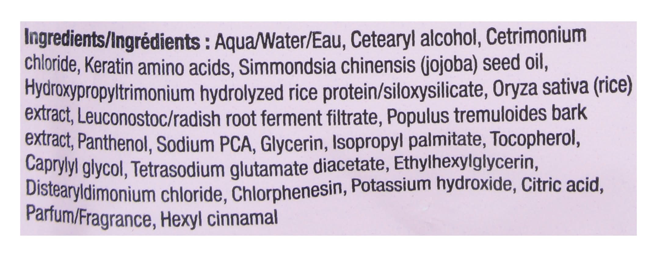 Ingredients: Aqua/Water/Eau, Cetearyl Alcohol, Cetrimonium Chloride, Keratin Amino Acids, Simmondsia Chinensis (Jojoba) Seed Oil, Hydroxypropyltrimonium Hydrolyzed Rice Protein/Siloxysilicate, Oryza Sativa (Rice) Extract, Leuconostoc/Radish Root Ferment Filtrate, Populus Tremuloides Bark Extract, Panthenol, Sodium PCA, Glycerin, Isopropyl Palmitate, Tocopherol, Caprylyl Glycol, Tetrasodium Glutamate Diacetate, Ethylhexylglycerin, Distearyldimonium Chloride, Chlorphenesin, Potassium Hydroxide, Citric Acid, Parfum/Fragrance, Hexyl Cinnamal