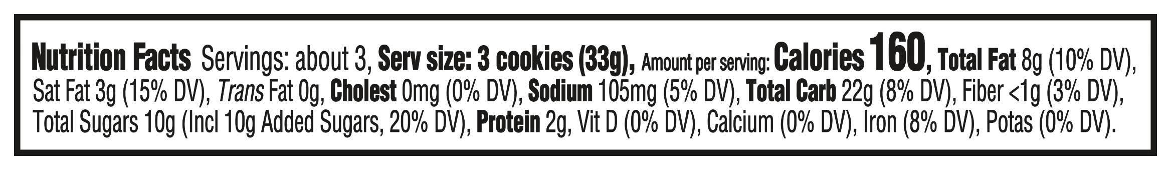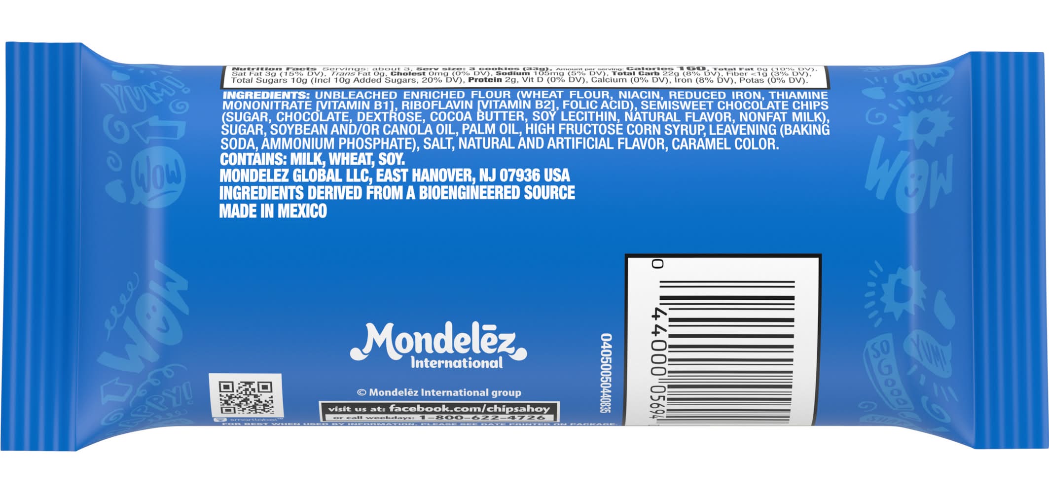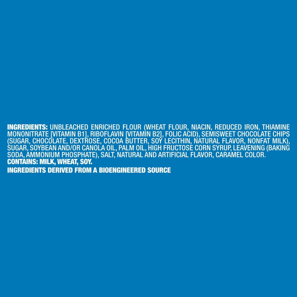 Ingredients: INGREDIENTS: UNBLEACHED ENRICHED FLOUR (WHEAT FLOUR, NIACIN, REDUCED IRON, THIAMINE MONONITRATE {VITAMIN B1}, RIBOFLAVIN {VITAMIN B2}, FOLIC ACID), SEMISWEET CHOCOLATE CHIPS (SUGAR, CHOCOLATE, COCOA BUTTER, DEXTROSE, MILK, SOY LECITHIN), SUGAR, SOYBEAN AND, OR CANOLA OIL, PALM OIL, HIGH FRUCTOSE CORN SYRUP, LEAVENING (BAKING SODA, AMMONIUM PHOSPHATE), SALT, NATURAL AND ARTIFICIAL FLAVOR, CARAMEL COLOR.CONTAINS: WHEAT, MILK, SOY. Contains: CONTAINS: WHEAT, MILK, SOY.