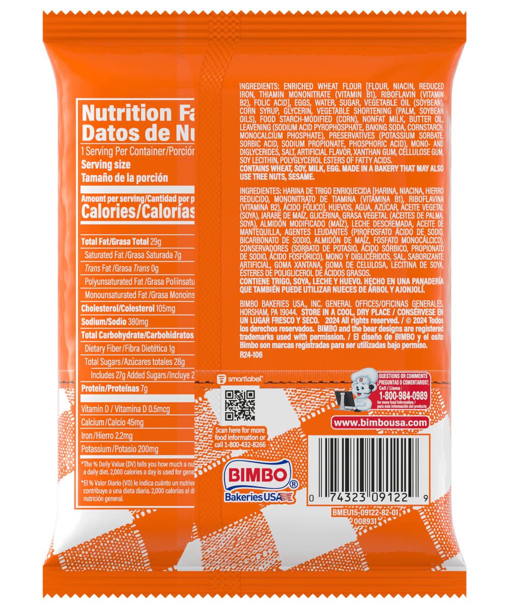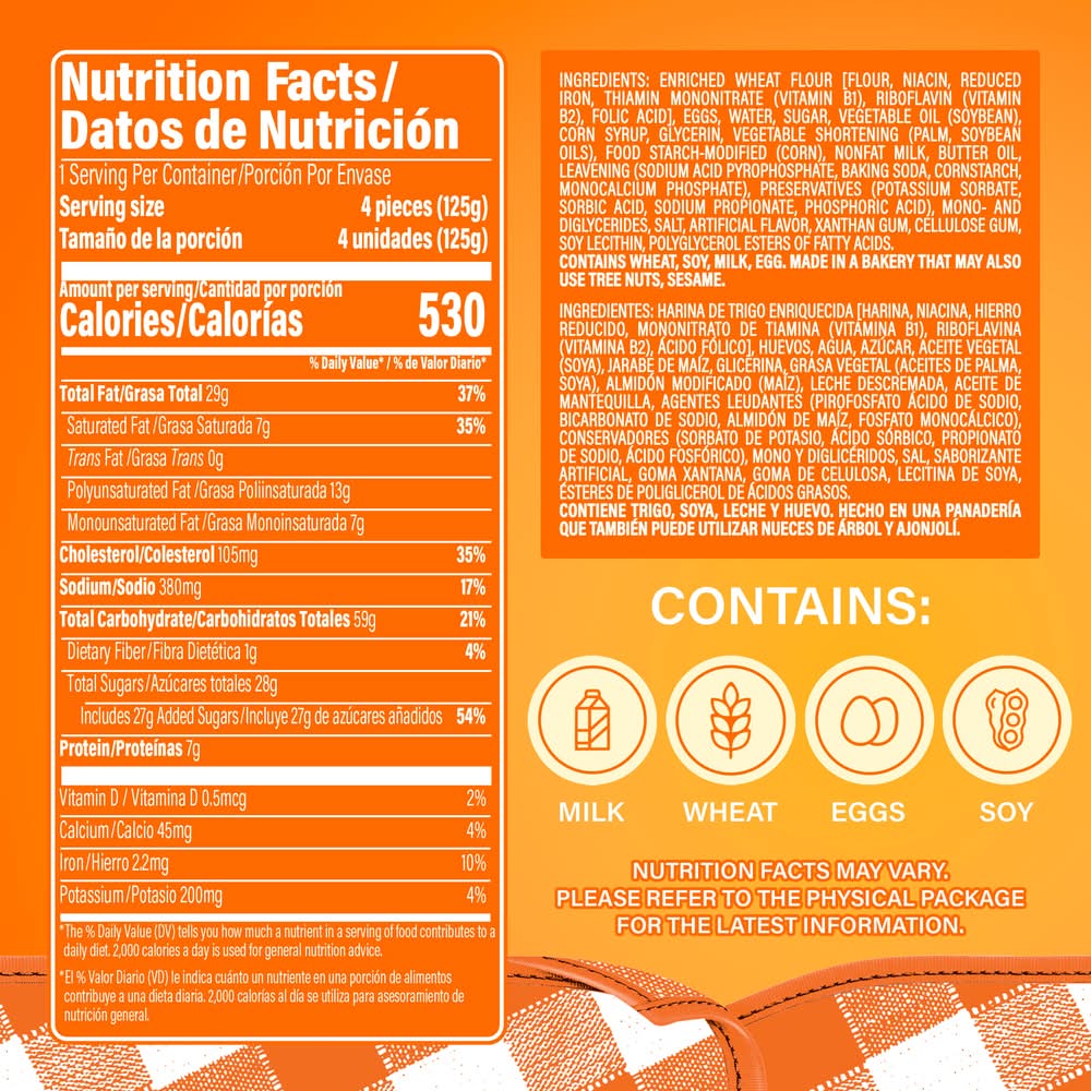 Ingredients: ENRICHED WHEAT FLOUR [FLOUR, NIACIN, REDUCED IRON, THIAMIN MONONITRATE (VITAMIN B1), RIBOFLAVIN (VITAMIN B2), FOLIC ACID], EGGS, WATER, SUGAR, VEGETABLE OIL (SOYBEAN), CORN SYRUP, GLYCERIN, VEGETABLE SHORTENING [PALM, SOYBEAN OILS], FOOD STARCH-MODIFIED (CORN), NON FAT MILK, BUTTER OIL, LEAVENING [SODIUM ACID PYROPHOSPHATE, BAKING SODA, CORNSTARCH, MONOCALCIUM PHOSPHATE], PRESERVATIVES [POTASSIUM SORBATE, SORBIC ACID, SODIUM PROPIONATE, PHOSPHORIC ACID], MONO- AND DIGLYCERIDES, SALT, ARTIFICIAL FLAVOR, XANTHAN GUM, CELLULOSE GUM, SOY LECITHIN, POLYGLYCEROL ESTERS OF FATTY ACIDS. Contains: CONTAINS EGG, MILK, SOY, WHEAT.