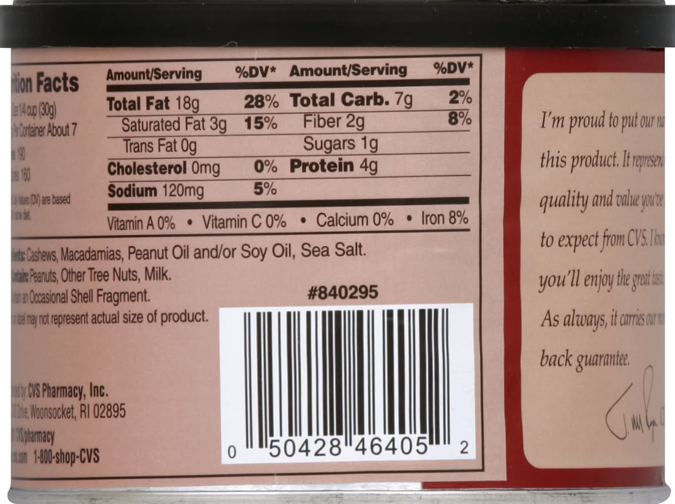 Ingredients: Cashews, Macadamias, Peanut Oil and/or Soy Oil, Sea Salt Contains: Milk, Peanuts, Tree Nuts