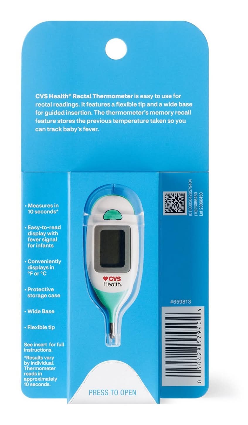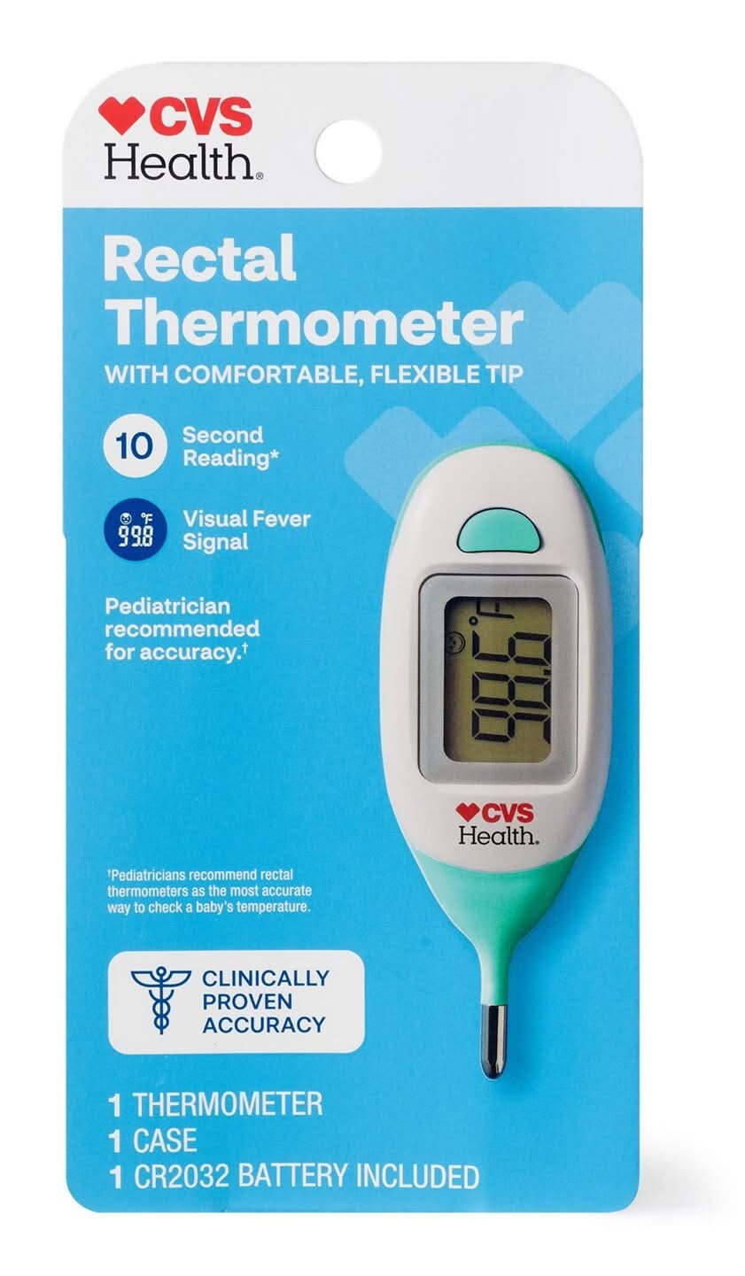 The CVS Health Digital Rectal Thermometer lets you comfortably take your infant’s temperature. It features a flexible tip and a wide base for guides insertion 10-second reading Memory recalls last temperature Read instructions thoroughly before using digital thermometer.