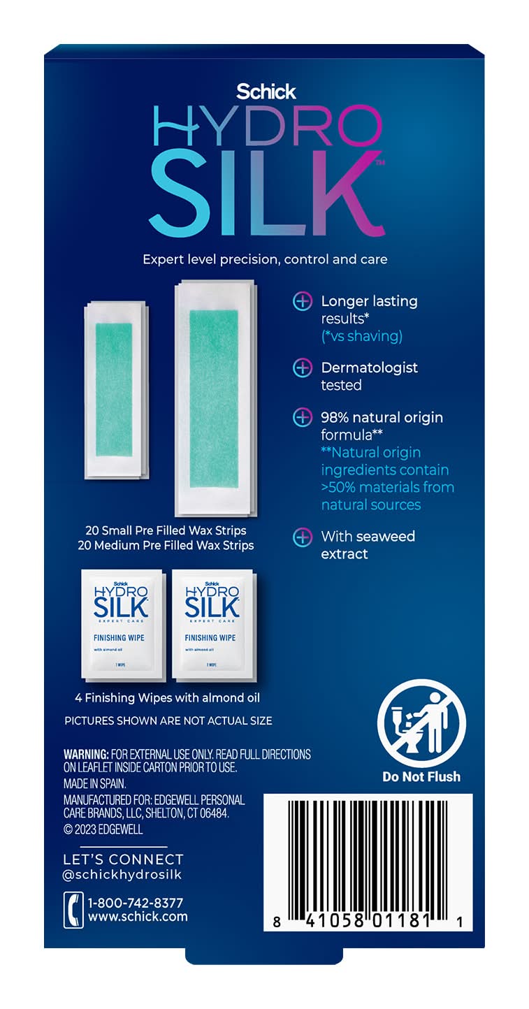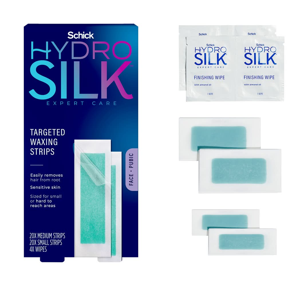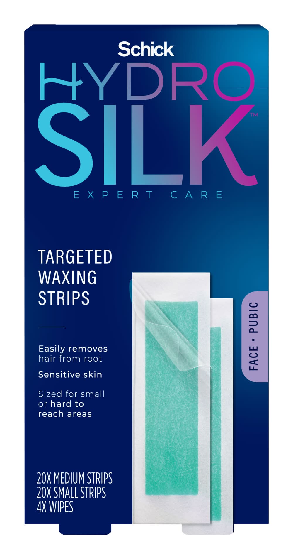 Silky smooth skin is just a few seconds away. Enjoy professional, salon-quality results right at home with our Schick Hydro Silk Ready-to-Use Targeted Waxing Strips. These convenient wax strips easily remove hair from the root and are perfectly sized for small or hard-to-reach places on the face, including upper lip and eyebrows, or the pubic and bikini area. They come ready to usewithout the need for warming or rubbingand provide longer lasting results than shaving. Formulated with seaweed and made from 98% natural origin*, our Hydro Silk wax strips are dermatologist-tested and specially designed for hair removal on sensitive skin.*How is a formula considered of natural origin? When more than half of the formulas material comes from natural sources, which may then be processed for use in cosmetic products