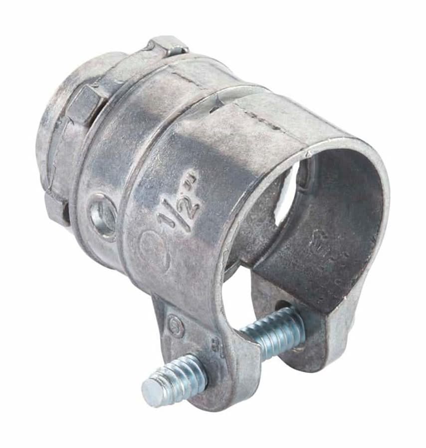 The 3/4 in. FMC Connectors (3-Pack) are designed to connect and bond flexible metal conduit (FMC) and armored cable to steel outlet boxes, load centers and other metal enclosures. They are made of high-strength zinc alloy and have vibration-proof screws. This connector meets UL and CSA requirements. Size: 1/2 in