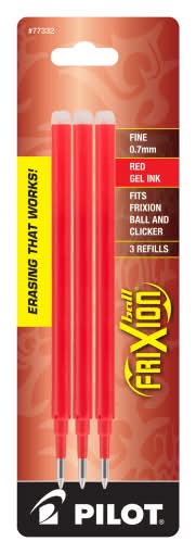 Keep your office stocked with plenty of pen refills to ensure you're always ready to take notes. The gel ink formula of these Pilot FriXion refills delivers smooth, smear-proof writing. Fits Pilot's FriXion Erasable, FriXion Ball, FriXion Clicker and FriXion LX pens. Thermo-sensitive gel ink formula. Easily and quickly disappears with the friction caused by erasing. • Pack size: 3 • Color: Red