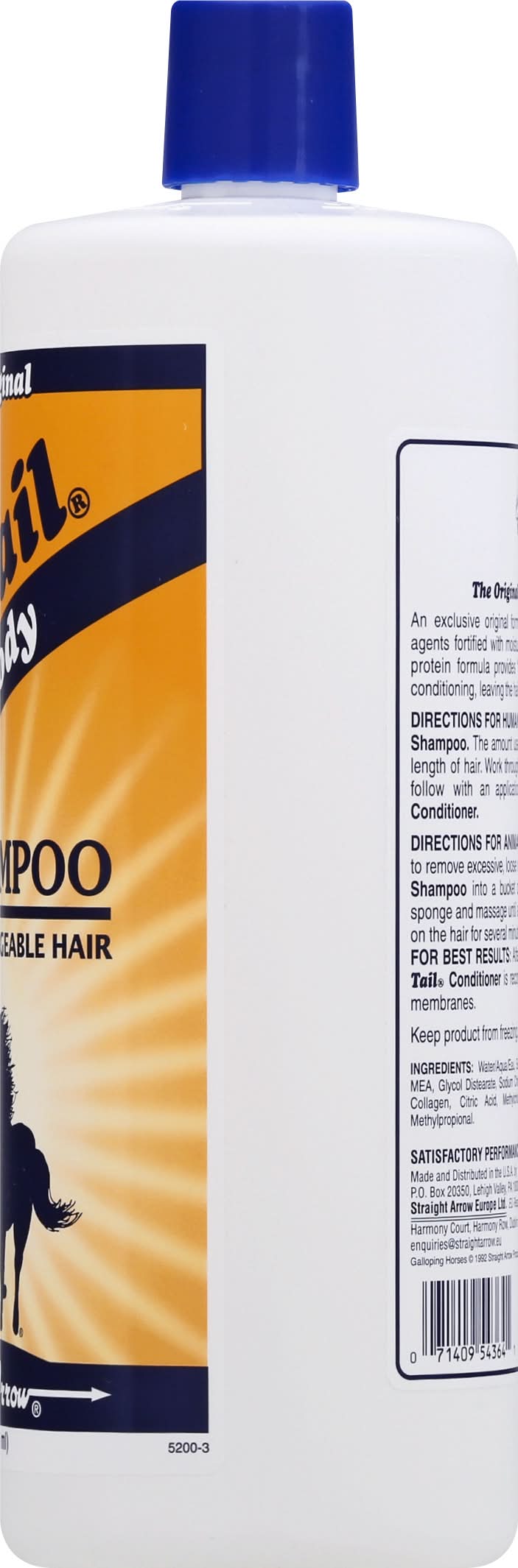 And body. For shiny, manageable hair. An exclusive original formula containing high lathering, cleansing agents fortified with moisturizers and emollients. Our micro-enriched protein formula provides down to skin cleansing action and conditioning, leaving the hair soft and shiny. Satisfactory Performance Guaranteed. manetail.com. Made in U.S.A. Straight Arrow Products, P.O. Box 20350,Lehigh Valley,PA