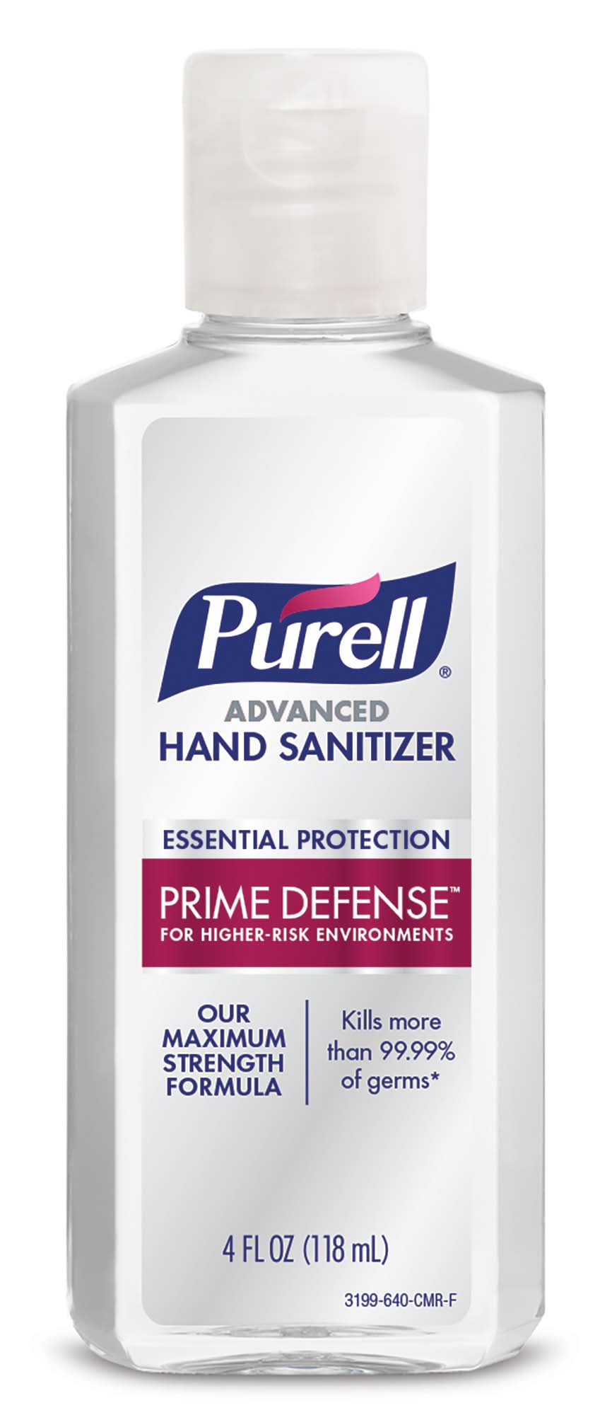PURELL PRIME DEFENSE™ Advanced Hand Sanitizer, 12CT, 4 fl oz Bottle • GOJO Industries, Inc., Akron, OH, 44309, Ph: 888-4-PURELL • Packaging: Reusable