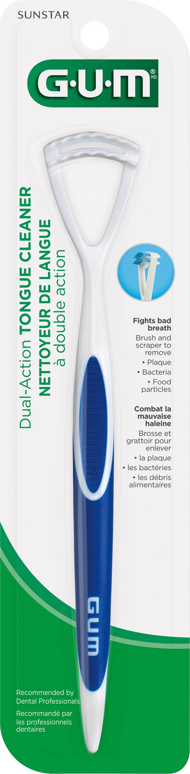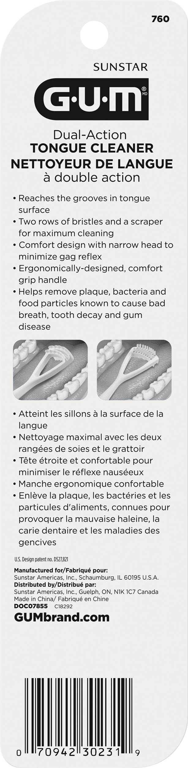 Fights bad breath. Brush and scraper to remove: plaque; bacteria; food particles. Recommended by dental professionals. Reaches the grooves in tongue surface. Two rows of bristles and scraper for maximum cleaning. Comfort design with narrow head to minimize gag reflex. Ergonomically-designed, comfort grip handle. Helps remove plaque, bacteria and food particles known to cause bad breath, tooth decay and gum disease. GUMbrand.com. Made in China. Sunstar Americas, Inc.,