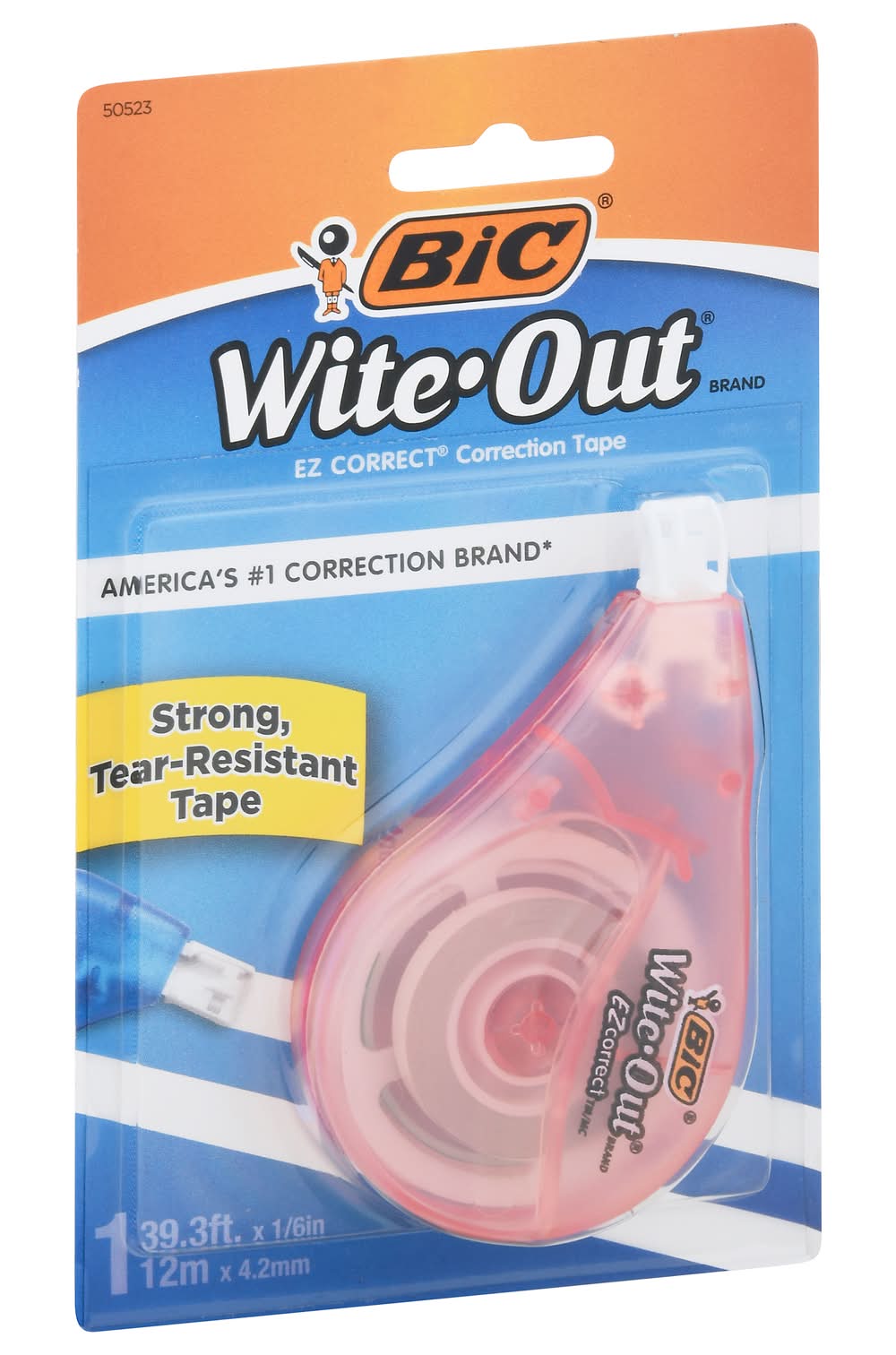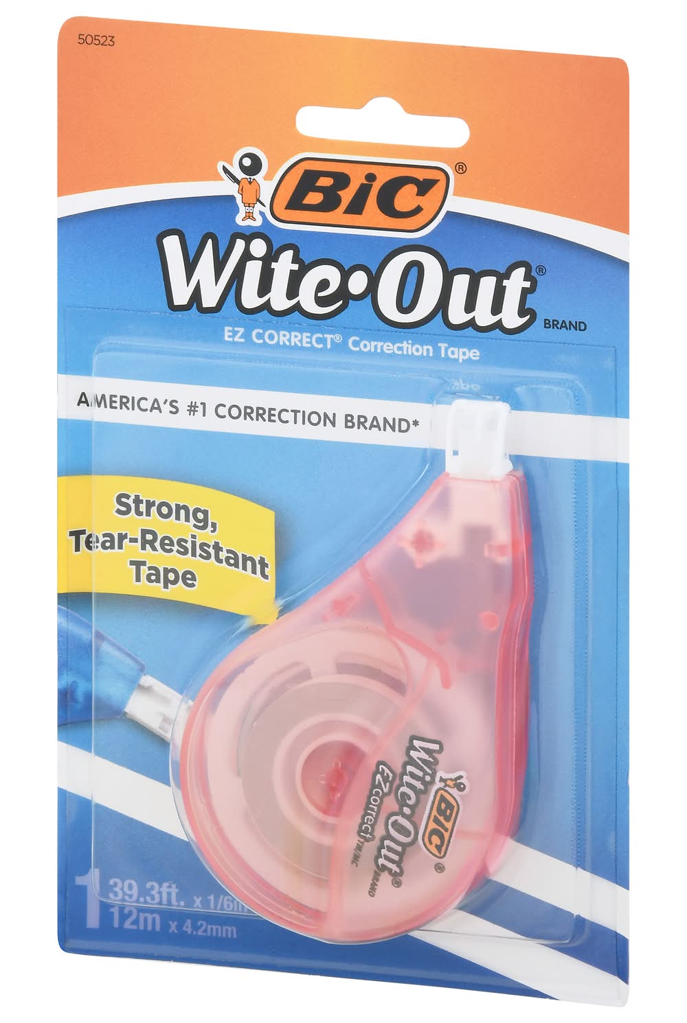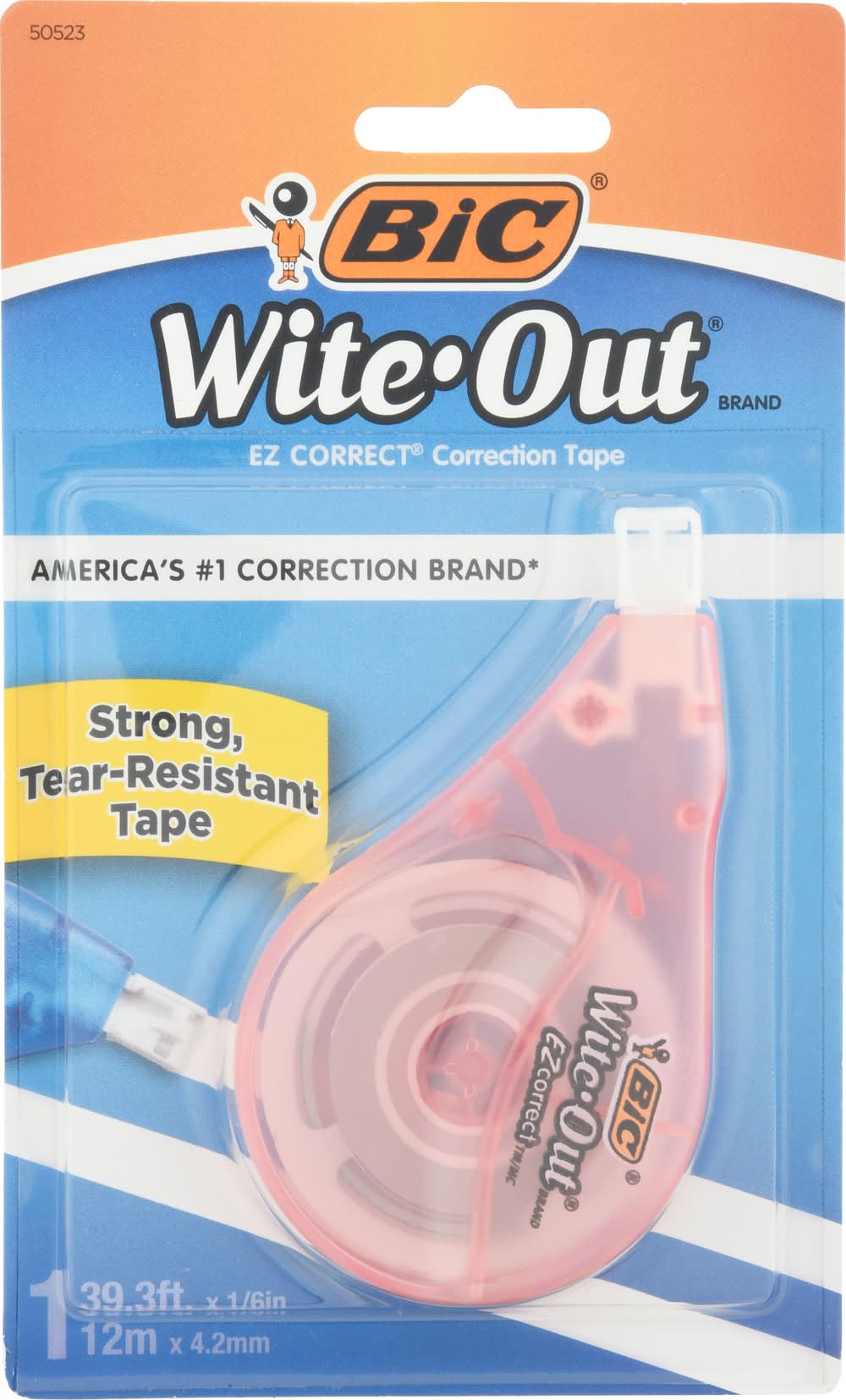 39.3 ft x 1/6 in (12 m x 4.2 mm). America's no.1 correction brand (Source: The NPD Group, Inc./U.S. Retail Tracking Service/Dollar Sales (Retail & Commercial Combined)/ Jan-Dec 2019)). Strong, tear-resistant tape. Film-based tape. Tape applies dry. Write or type over immediately. White single line. Non-refillable. BIC Performance Policy (U.S. and Canada): If you are not fully satisfied with the performance of this product, please return it to BIC and we will gladly replace it no cost to you. ww.bic.com. how2recycle.info. Made in Japan. Size: 1 CT