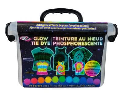 Use this glow-in-the-dark tie dye kit to create a fabulously unique T-shirt that's made by you. You just add water to six of the squeeze bottles along with the glow mixer, shake and apply the dye in the tie-dye design you want. Includes assorted pieces . Add glow into any 6 tie-dye colors to make dyes glow in the dark. Includes instructions and project inspiration . For use on fibers such as 100% cotton, rayon and silk.