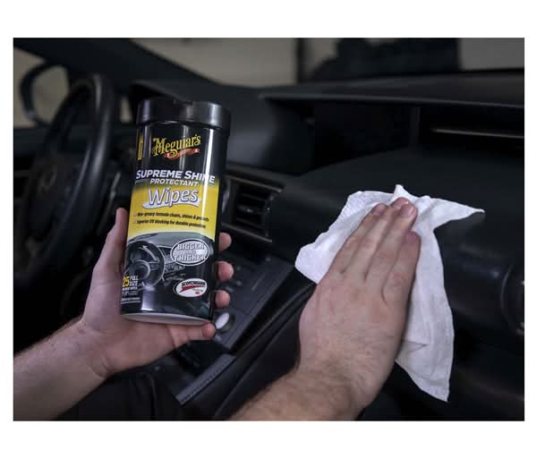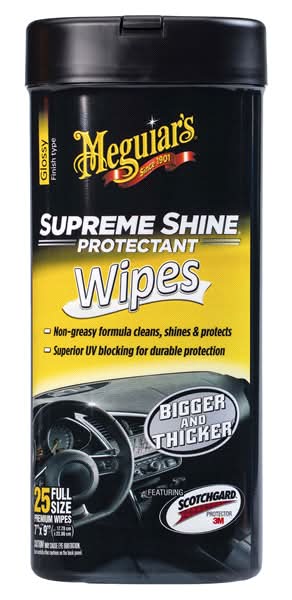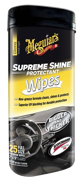 Meguiars Supreme Shine Protectant Wipes are designed to protect vinyl, rubber, and plastic surfaces while leaving a semi-gloss shine.