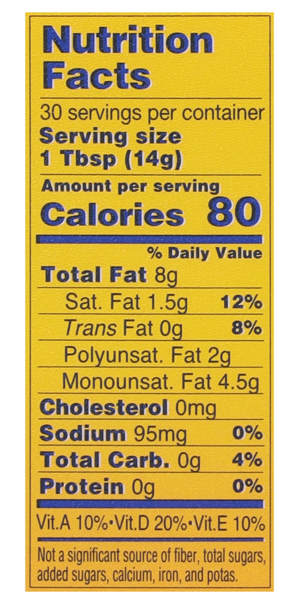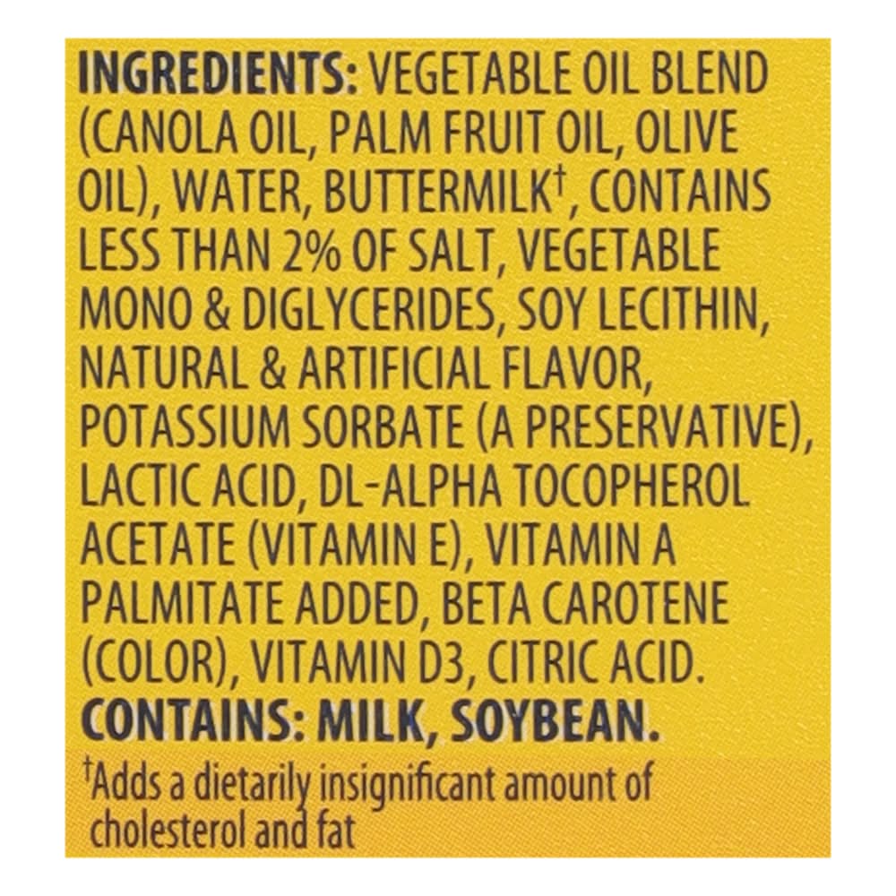 Vegetable Oil Blend (Canola Oil, Palm Fruit Oil, Olive Oil), Water, Buttermilk(a), Contains Less than 2% of Salt, Vegetable Mono & Diglycerides, Soy Lecithin, Natural & Artificial Flavor, Potassium Sorbate (a Preservative), Lactic Acid, DL-Alpha Tocopherol Acetate (Vitamin E), Vitamin A Palmitate Added, Beta Carotene (Color), Vitamin D3, Citric Acid. (a) Adds a Dietarily Insignificant Amount of Cholesterol and Fat Contains: Milk, Soybeans Additives: None
