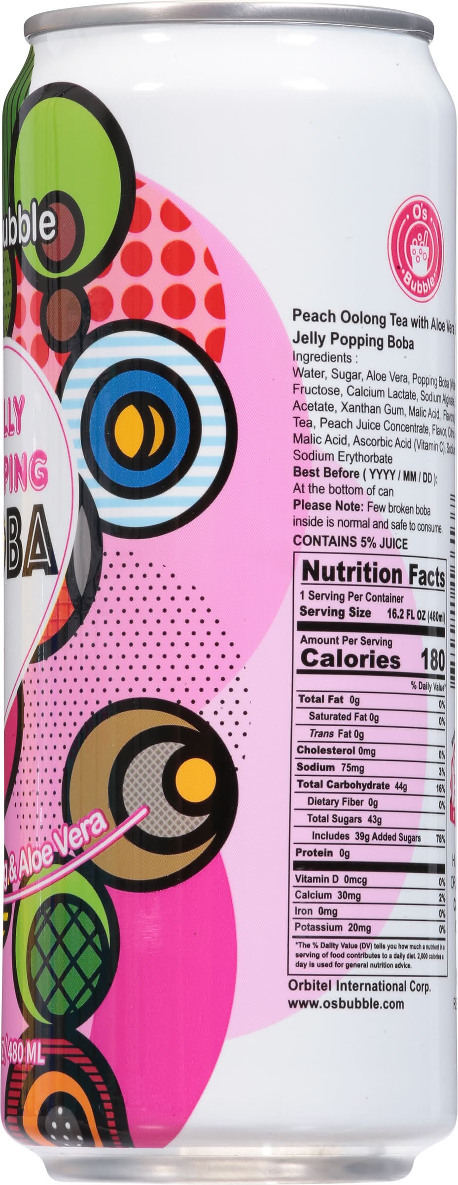 Peach oolong tea + jelly popping boba + aloe vera. Please Note: Few broken boba inside is normal and safe to consume. Popping in your mouth. Contains real juice. www.osbubble.com. Recycle. Made in Taiwan. Premium Taiwan product. Orbitel International Corp.,
