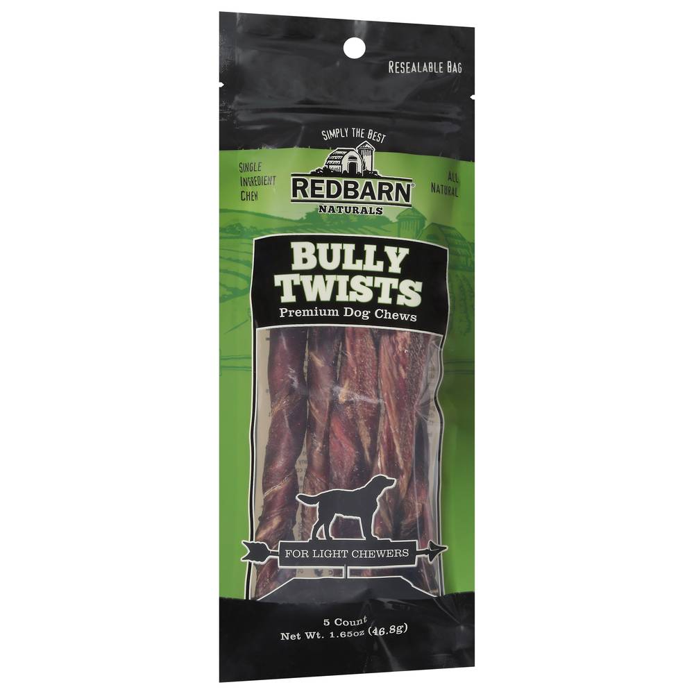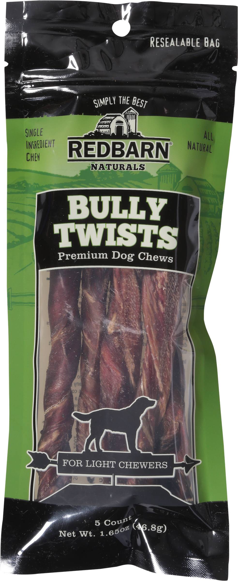 No grains or gluten Simply the best. Naturals. Single ingredient chew. All natural. For light chewers. Features You'll Love: Support dental health; No artificial additives; Slow roasted for maximum flavor; Fun twisted design. A family-owned business since 1996, Redbarn is committed to making chews with the health. And safety of your dog in mind. Made from all-natural beef pizzle, Bully Twists offer a twist on Bully Sticks. Easier to chew, they're a great introduction to Bully Sticks for puppies or seniors with sensitive gums or teeth. Plus, this highly palatable chew helps support your dog's overall dental health while fighting boredom throughout the day. www.redbarn.com. Facebook. Twitter. Instagram. Resealable bag. Product of Brazil or Paraguay. Redbarn Pet Products, LLC,