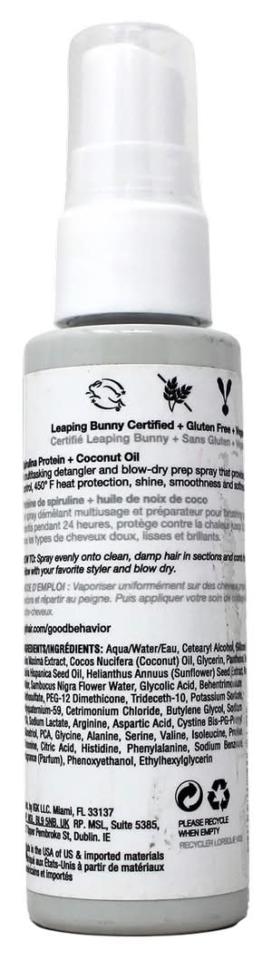 Good Behavior is like a keratin treatment in a can with 24-hour frizz control and 450-degree heat protection. It also helps cut down on blow-drying time and protects against humidity, heat and UV damage, leaving hair soft, shiny and frizz-free.