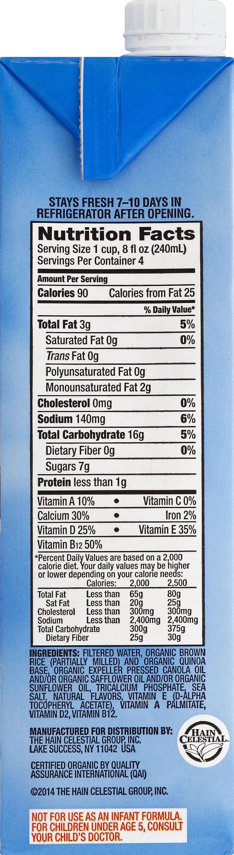 Filtered Water, Organic Brown Rice (Partially Milled) and Organic Quinoa Base, Organic Expeller Pressed Canola Oil and/or Organic Safflower Oil and/or Organic Sunflower Oil, Tricalcium Phosphate, Sea Salt, Natural Flavors, Vitamin E (D-Alpha Tocopheryl Acetate), Vitamin A Palmitate, Vitamin D2, Vitamin B12