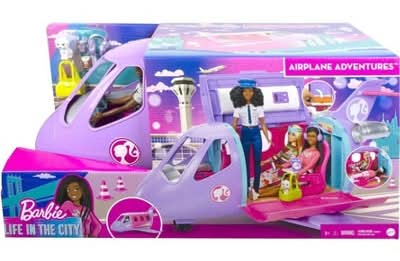 Imaginations can travel around the world with this Barbie Airplane Adventures playset inspired by Barbie Life in the City! Kids can recreate onscreen adventures or dream up their own travel stories with a Barbie pilot doll and her very own jet. The bright and colorful airplane features realistic touches, like rolling wheels, reclining seats, working overhead bins and seating for two passengers, plus a seat for the pilot doll and 15 travel-themed accessories that inspire storytelling fun. Customize the plane with a travel-themed sticker sheet, then take to the sky with Barbie pilot doll and her pet puppy! With so many cool features and storytelling opportunities, this Barbie Airplane Adventures playset can go wherever kids' imaginations lead! Doll cannot stand alone. Colors and decorations may vary. Color: Multicolour