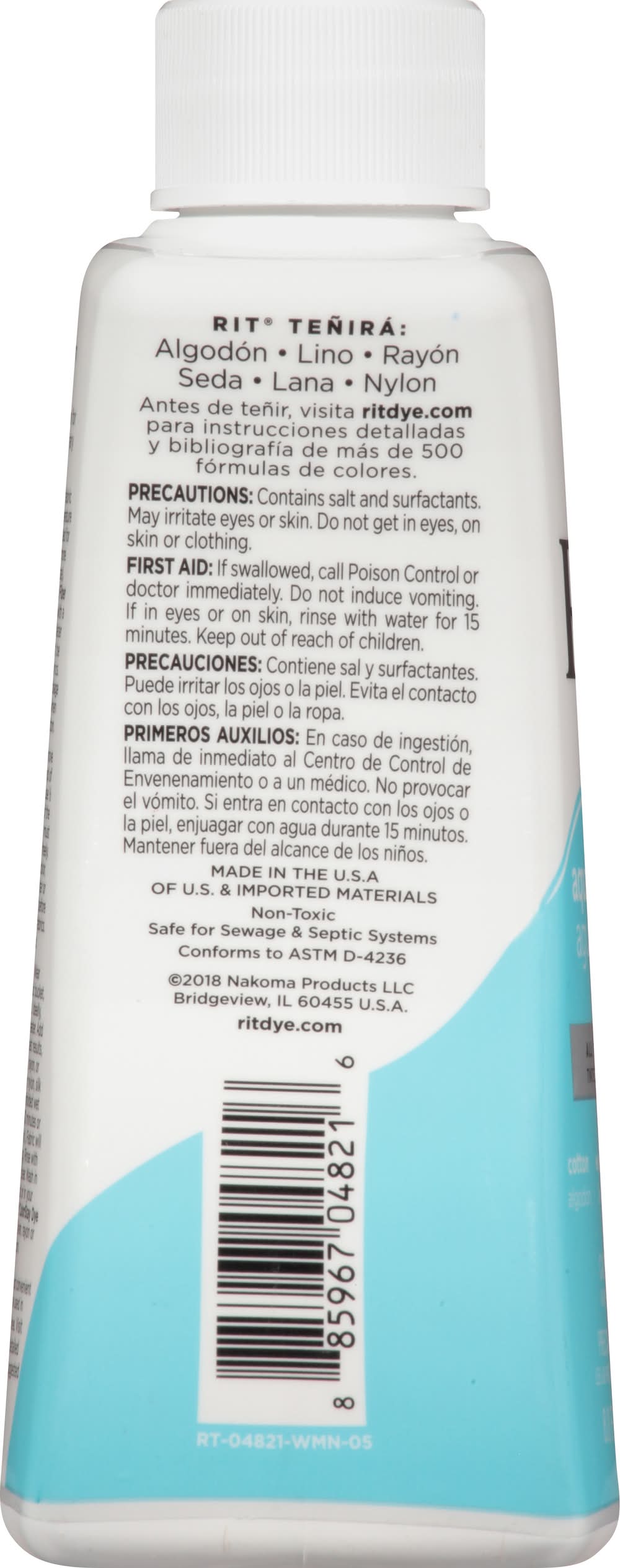 Celebrating a 100 century. Cotton, wool, nylon + more. Rit Will Dye: Cotton. Linen. Rayon. Silk. Wool. Nylon. Non-toxic safe for sewage & septic systems. Conforms to ASTM D4236. ritdye.com. Before dyeing, visit ritdye.com for detailed instructions and a library of over 500 color recipes. Made in the U.S.A of U.S. & imported materials. • Nakoma Products LLC, • Packaging: Reusable