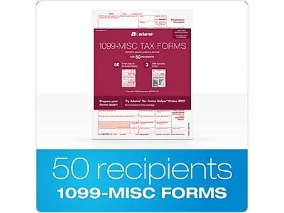 Get the Adams 1099-MISC form you need to report miscellaneous income and payer-made sales of $5000 or more. The pack includes 50 five-part 1099-MISC and three 1096 forms. - Use the form 1099-MISC to report miscellaneous income and payer-made sales of $5000 or more - For paper filers, the 2022 1099-MISC Copy B is due to your recipients by Jan. 31, 2023 (if box 8 and 10 are empty) or Feb. 15 (if filled); Copy A and 1096 are due by Feb. 28 or e-File by Mar. 31, 2023 - Five-part 1099-MISC forms print two to a page on 25 microperforated sheets with Copies A, C/1, B, 2, and C/1 - Inkjet and laser printer compatible - Pack contains 50 1099-MISC form sets and three 1096 summary forms - As of 2022, the IRS has made the 1099-MISC a continuous-use form with a new fill-in-the-year date field good for multiple tax years; the previously unnumbered FATCA box is now box 13 on the 1099-MISC and remaining boxes have been renumbered - Sheet size: 8.5 x 11; detached size: 5.5 x 8.5 - White form has a scannable red ink Copy A and 1096 required by the IRS for paper filing - Acid-free paper and heat-resistant inks produce smudge-free, archival-safe records - Meets or exceeds the IRS standard - Online tax software sold separately - Compatible with QuickBooks, Adams Tax Forms Helper, and other accounting and tax software programs - Don't forget to add 2-up 1099 envelopes (not included)